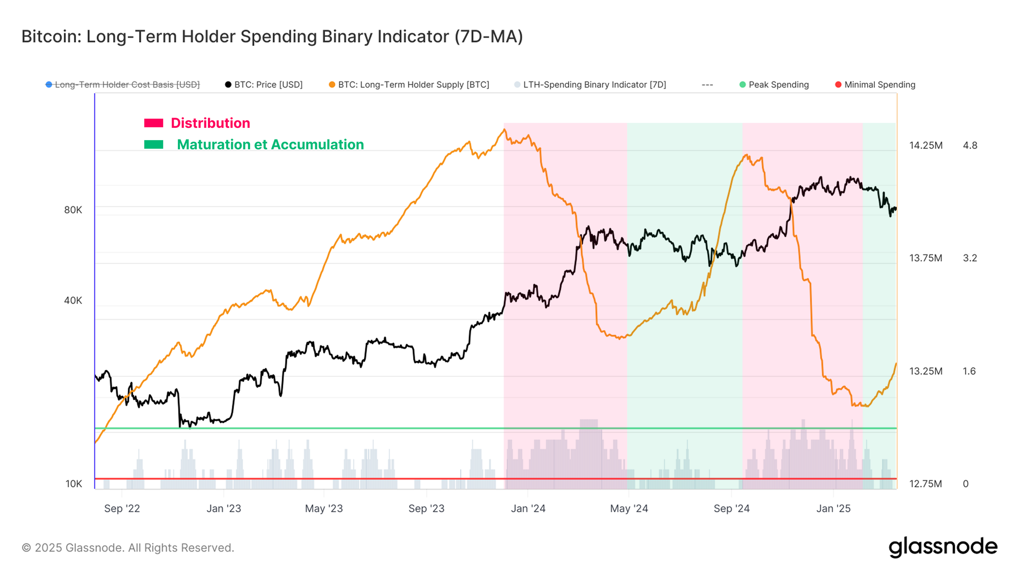 Nous pouvons quantifier ce phénomène à l'aide de l'indicateur binaire de dépenses, qui est conçu pour repérer les HODLers qui dépensent une part importante de leurs avoirs de manière soutenue.