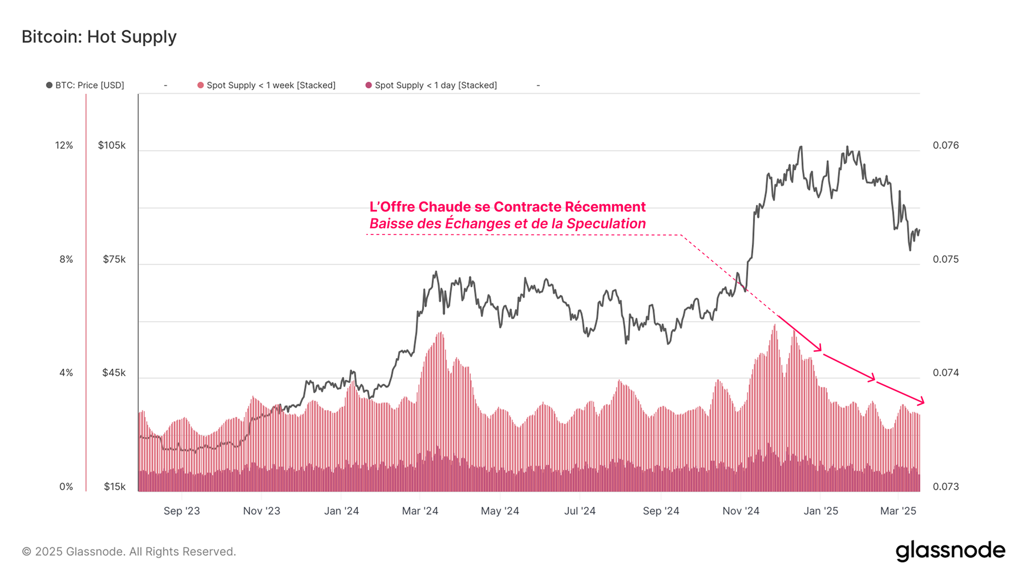 Une méthode pour mesurer et quantifier le capital actif sur le marché est la métrique "Hot Supply". Ce volume d'offre représente la richesse détenue dans les BTC âgés d'une semaine ou moins et peut être considéré comme une approximation des BTC disponibles et prêts à être échangées.