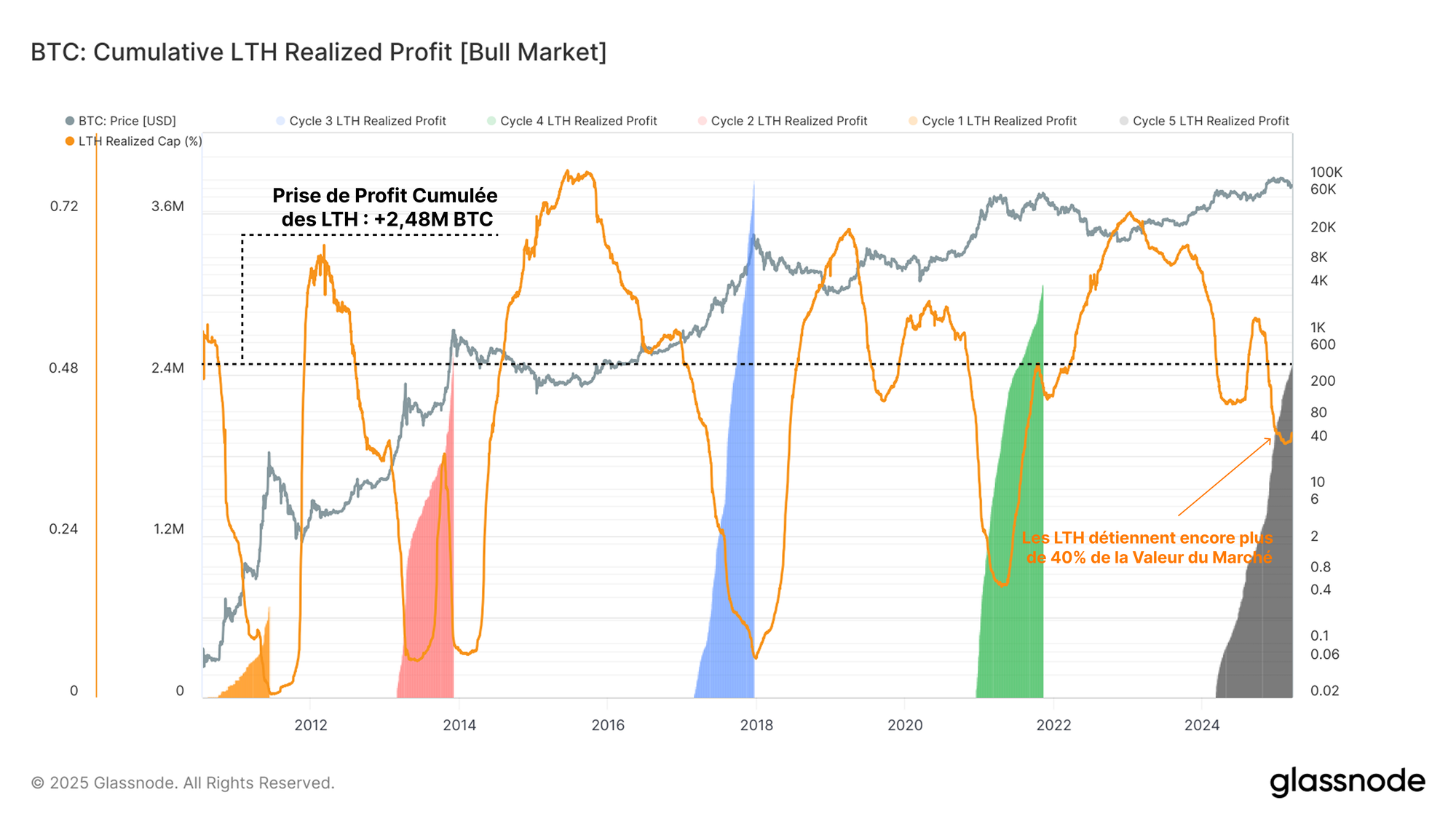 L'indicateur ci-dessous évalue les bénéfices cumulés réalisés par les LTH depuis la cassure de l'ATH du cycle précédent. Nous pouvons alors quantifier la pression de vente que chaque cycle a absorbée, en fournissant une approximation de la demande qui était nécessaire pour l'absorber et soutenir le marché haussier.