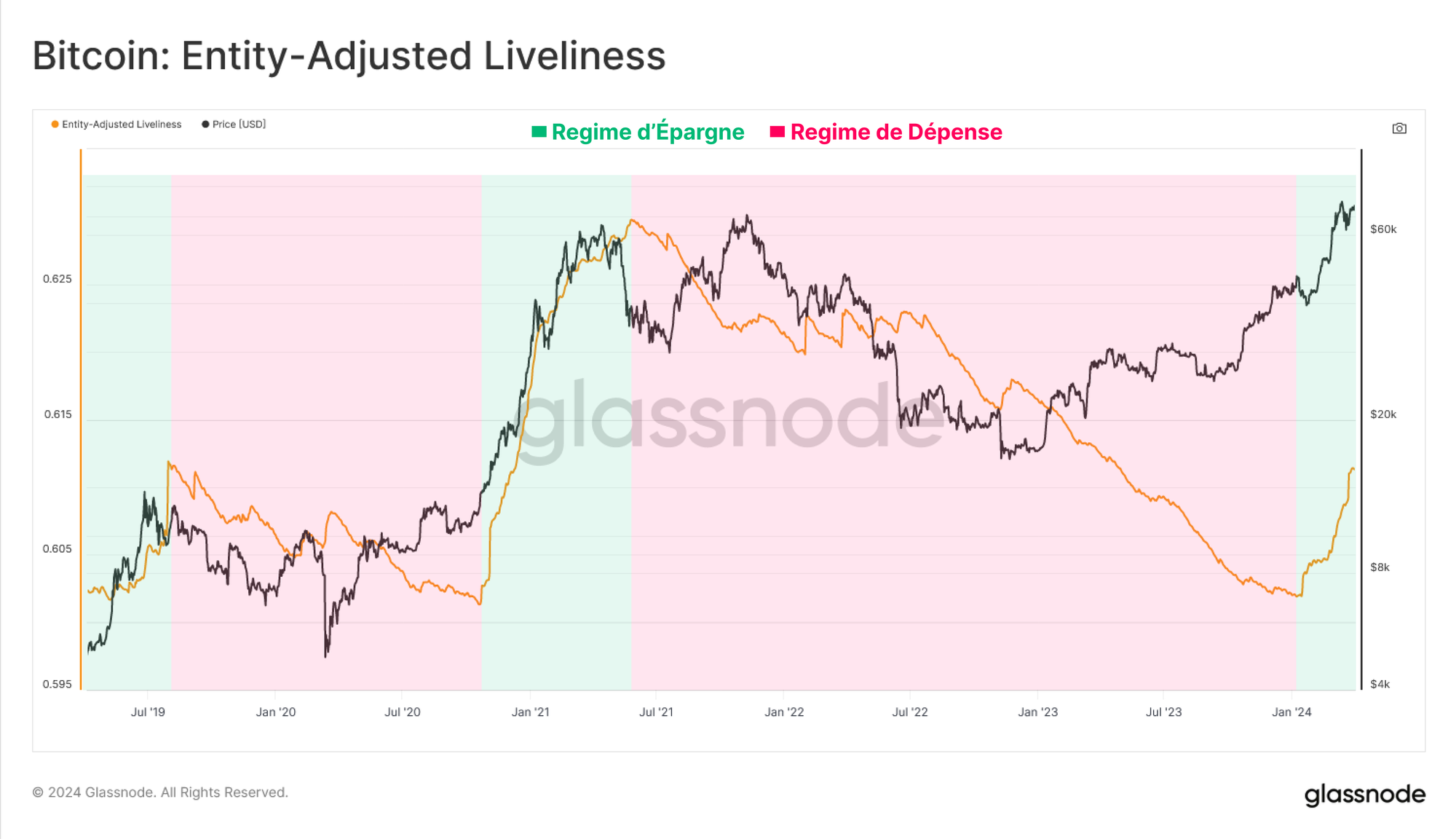 La vivacité connaît une hausse soutenue, ce qui indique que, dans l'ensemble, la dépense des BTC en dormance depuis longtemps dépasse l'accumulation du "temps de détention" des BTC épargnés.
