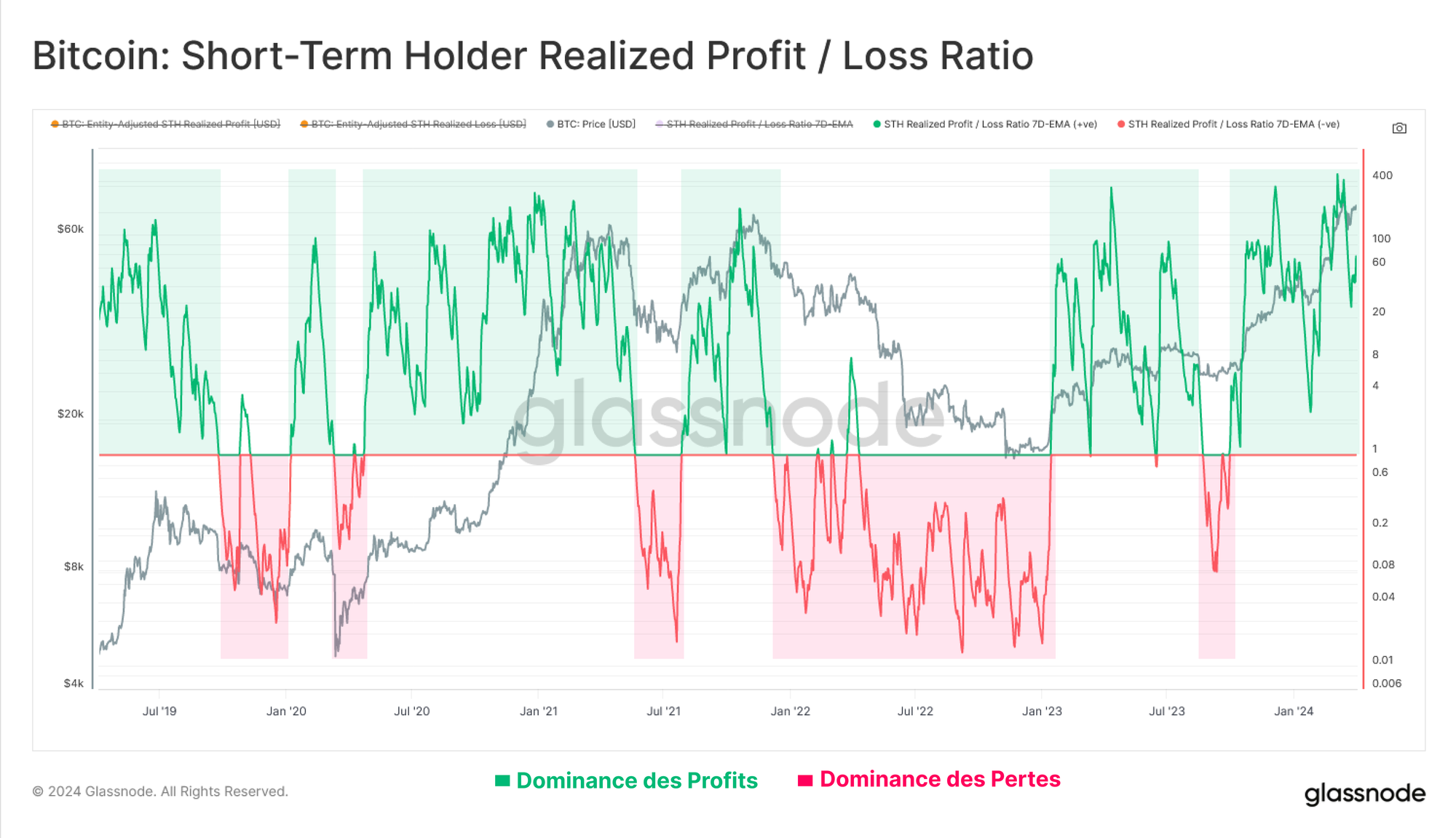 En commençant par les détenteurs à court terme, nous pouvons voir que leur ratio profits/pertes reste bien dans un régime dominé par les profits, avec des prises de bénéfices dépassant les pertes de 50x.
