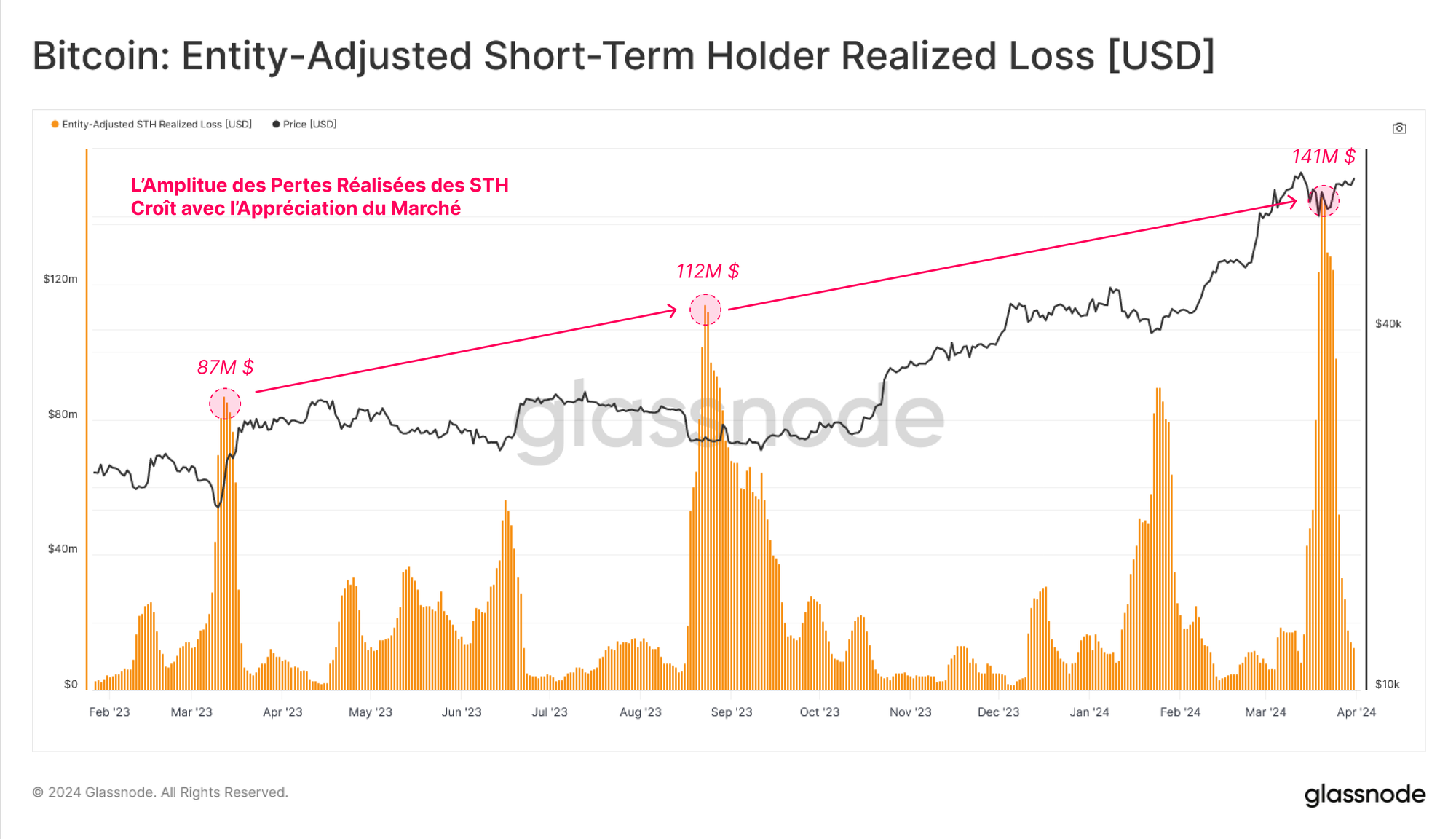 Nous pouvons également constater que les pertes réalisées des STH augmentent pendant les baisses, car les acheteurs de sommets locaux paniquent en pensant que le marché pourrait baisser.