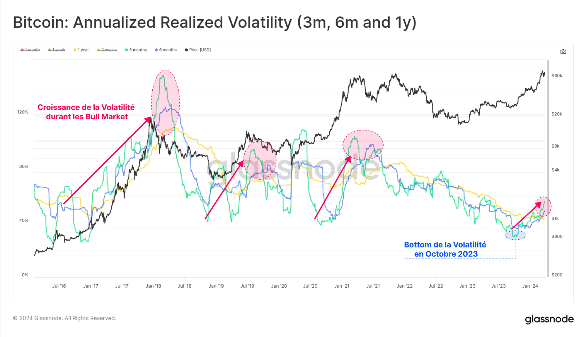 Au cours des cycles antérieurs du bitcoin, il est typique qu'une augmentation de la nouvelle demande tende à s'accompagner d'un appétit accru pour la spéculation. Il en résulte des marchés de plus en plus volatils, ce qui est caractéristique des bull market du bitcoin.
