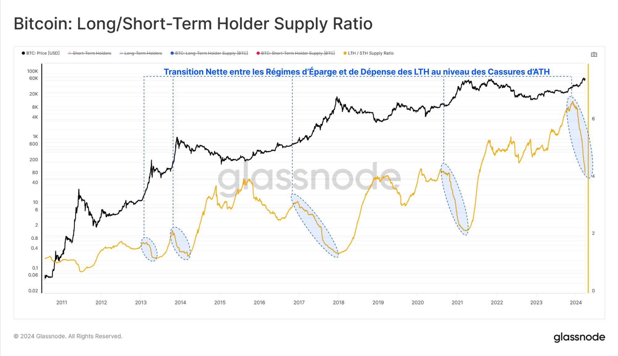 Cette mesure augmente avec les ruptures historiques de l'ATH, ce qui suggère que la pression de distribution et la prise de bénéfices par la cohorte LTH sont similaires aux cycles précédents sur une base relative.