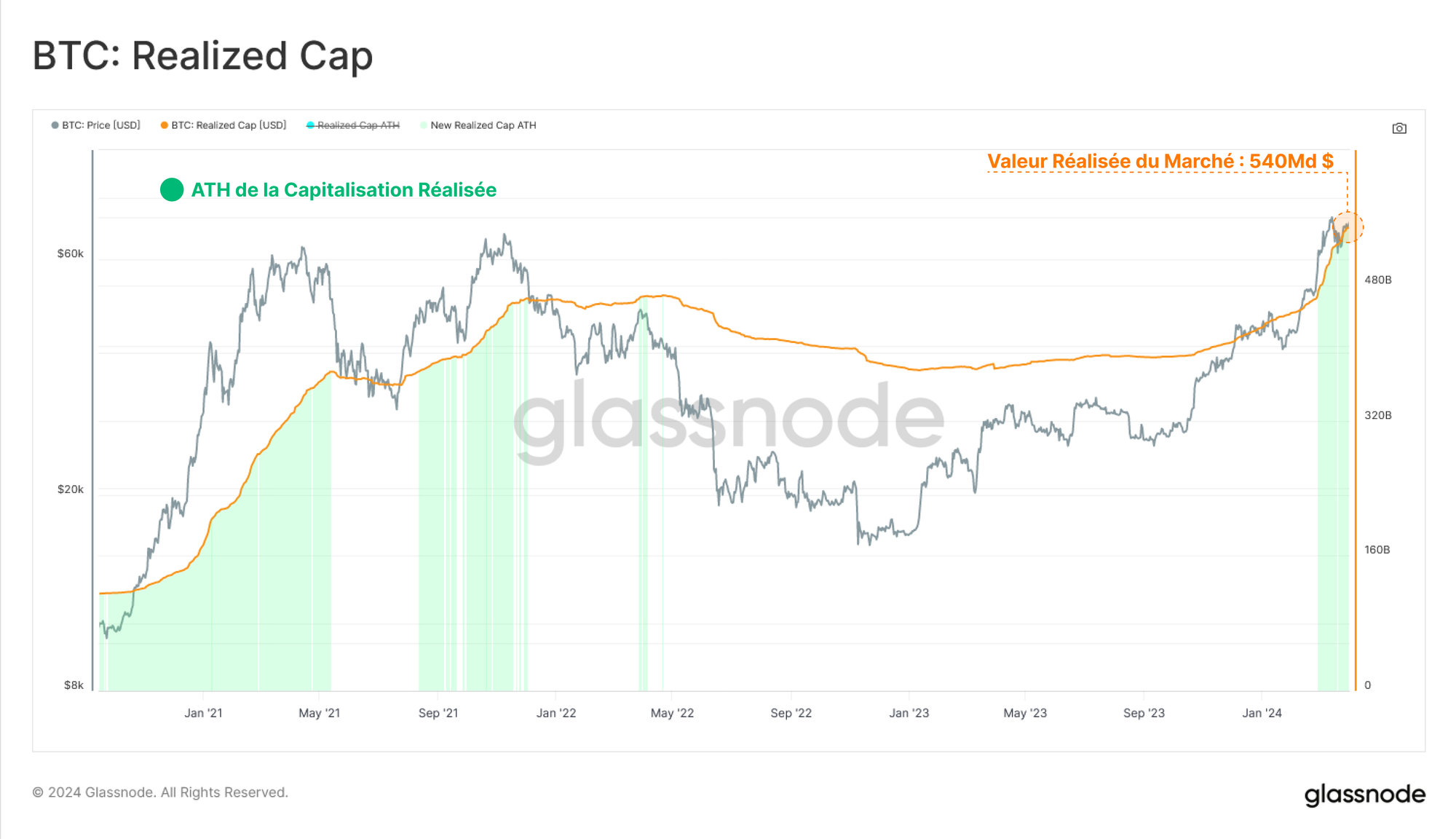 La capitalisation réalisée a atteint un nouvel ATH de 540 milliards de dollars et augmente à un rythme sans précédent de plus de 79 milliards de dollars par mois.