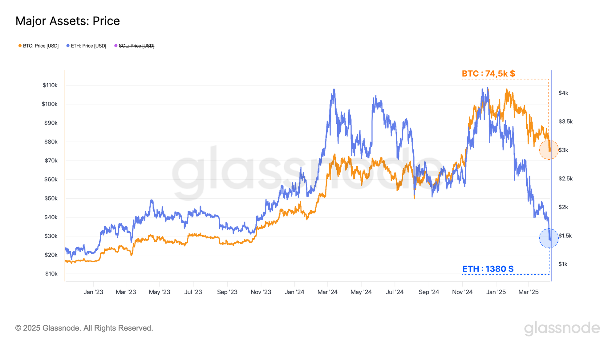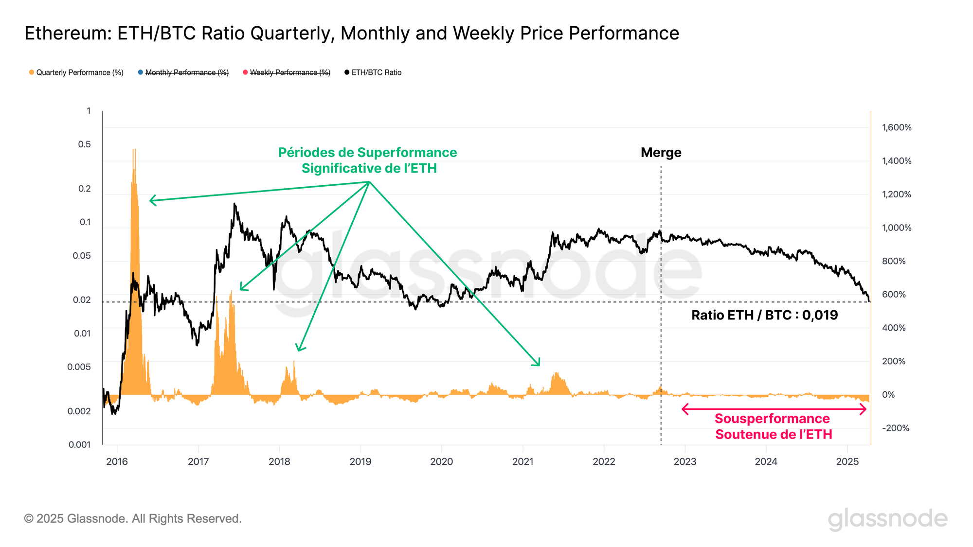 En mesurant à partir du Merge en septembre 2022, le ratio ETH/BTC s'est effondré d'une valeur de 0,080 à une valeur actuelle de 0,0196, reflétant une baisse de -75%.