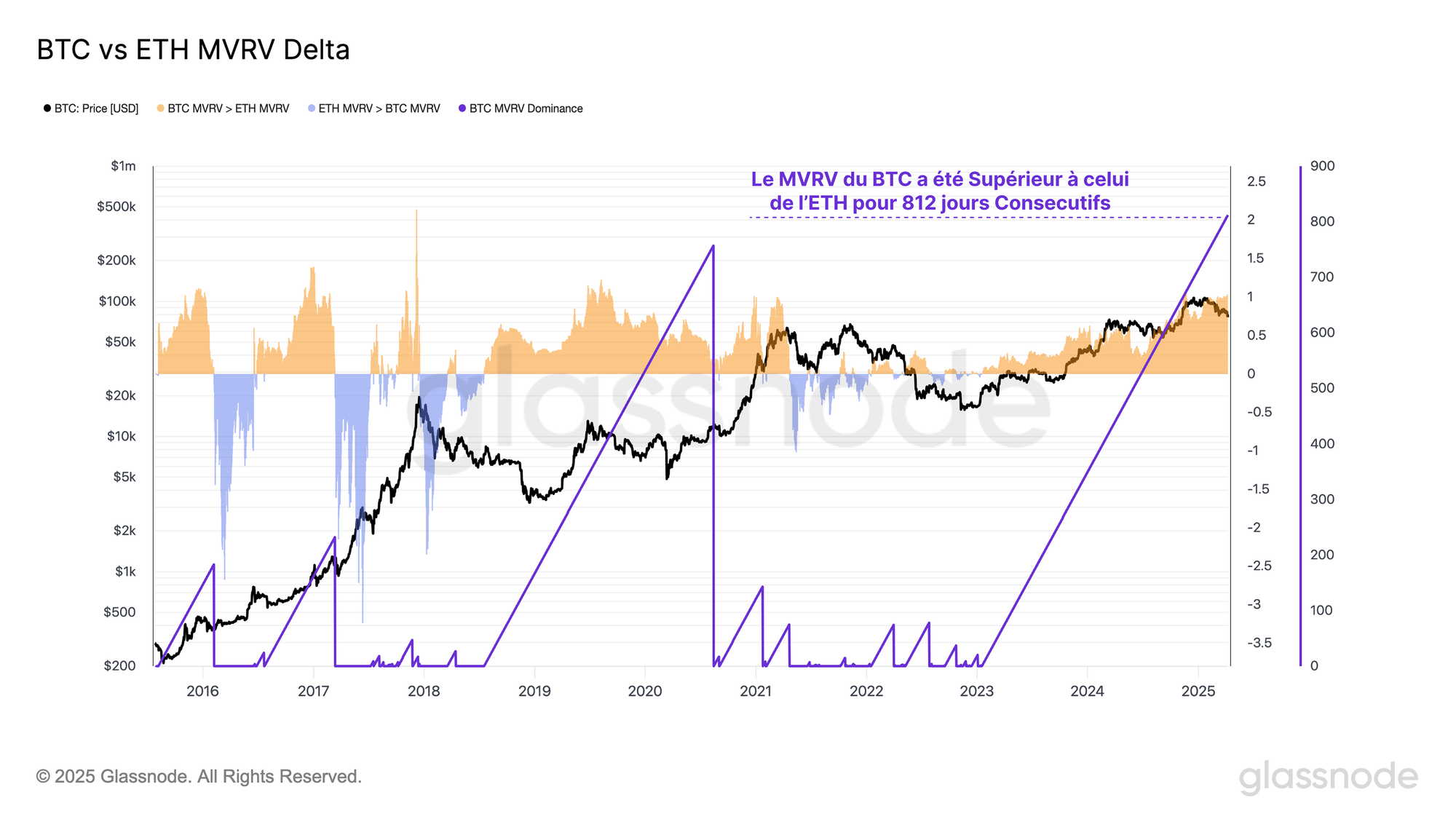 En calculant la différence entre les ratios MVRV du BTC et de l'ETH, nous pouvons identifier les périodes durant lesquelles le détenteur moyen de BTC surpasse (ou sous-performe) le détenteur moyen d'ETH en termes de profits latents.