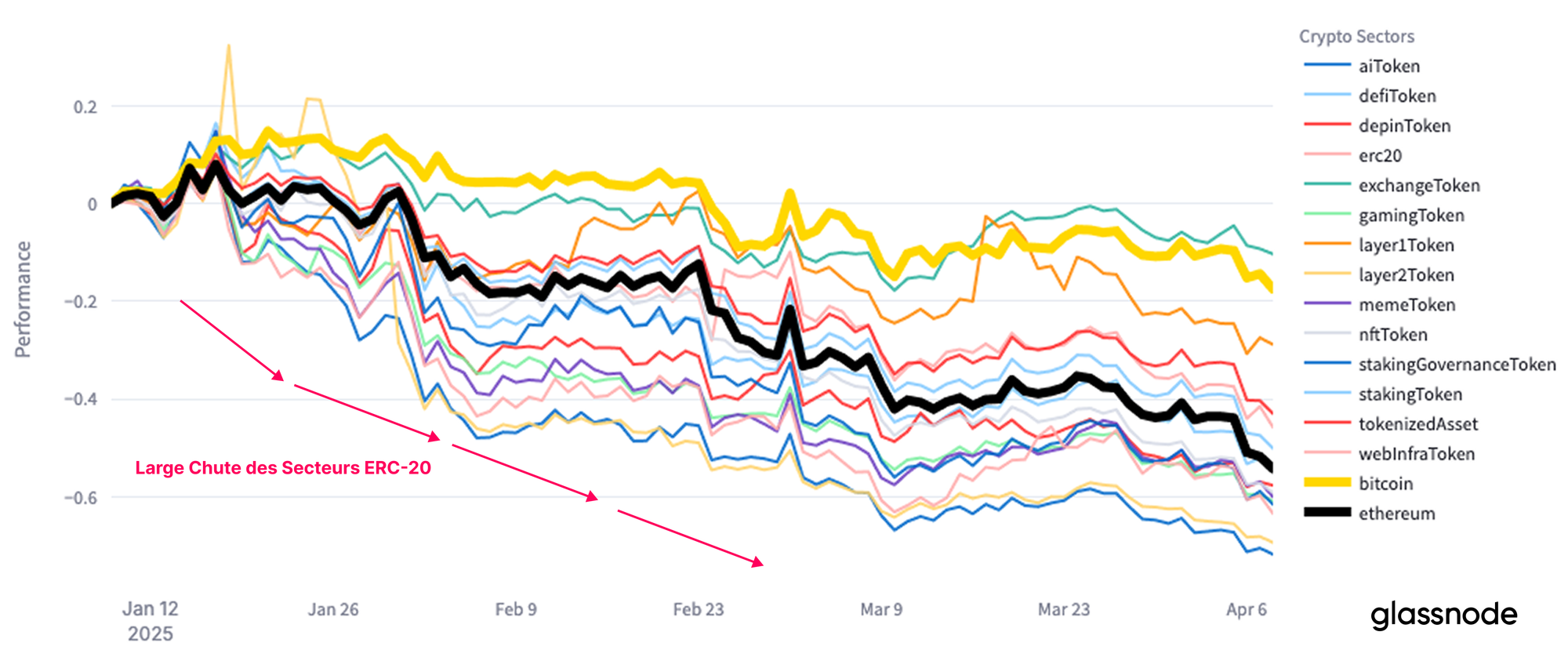 La contraction semble généralisée, tous les secteurs ayant subi une dévaluation significative, même le BTC ayant enregistré une performance négative au cours des trois derniers mois.