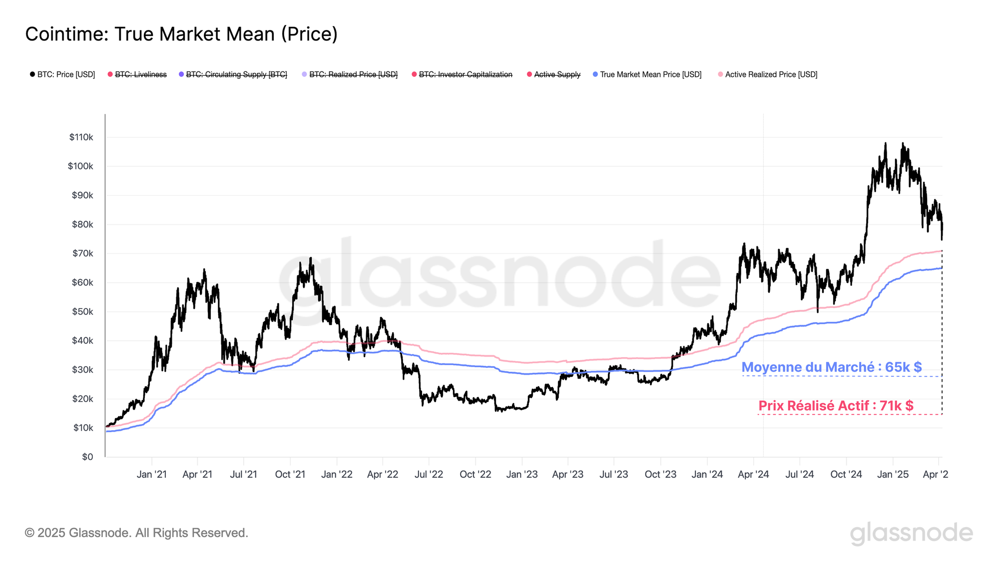 Le prix réalisé actif et la moyenne réelle du marché constituent un autre ensemble de modèles de prix qui représente une estimation du coût de base des participants actifs au marché, en déduisant l'offre perdue et dormante.