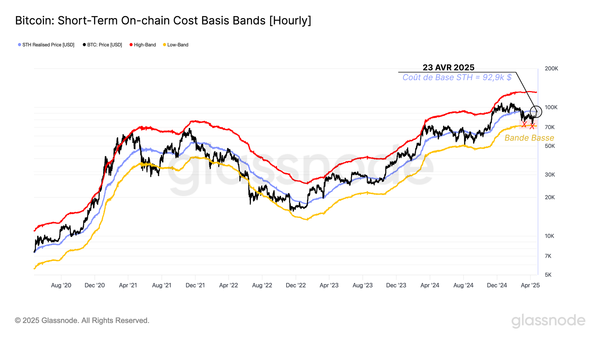 Ce modèle reflète le prix d'achat moyen des participants qui ont récemment acquis leurs avoirs, et agit souvent comme un niveau pivot clé. Historiquement, une cassure durable au-dessus de ce modèle de prix a marqué la transition entre les périodes de corrections baissières et le regain d'optimisme lors des reprises.
