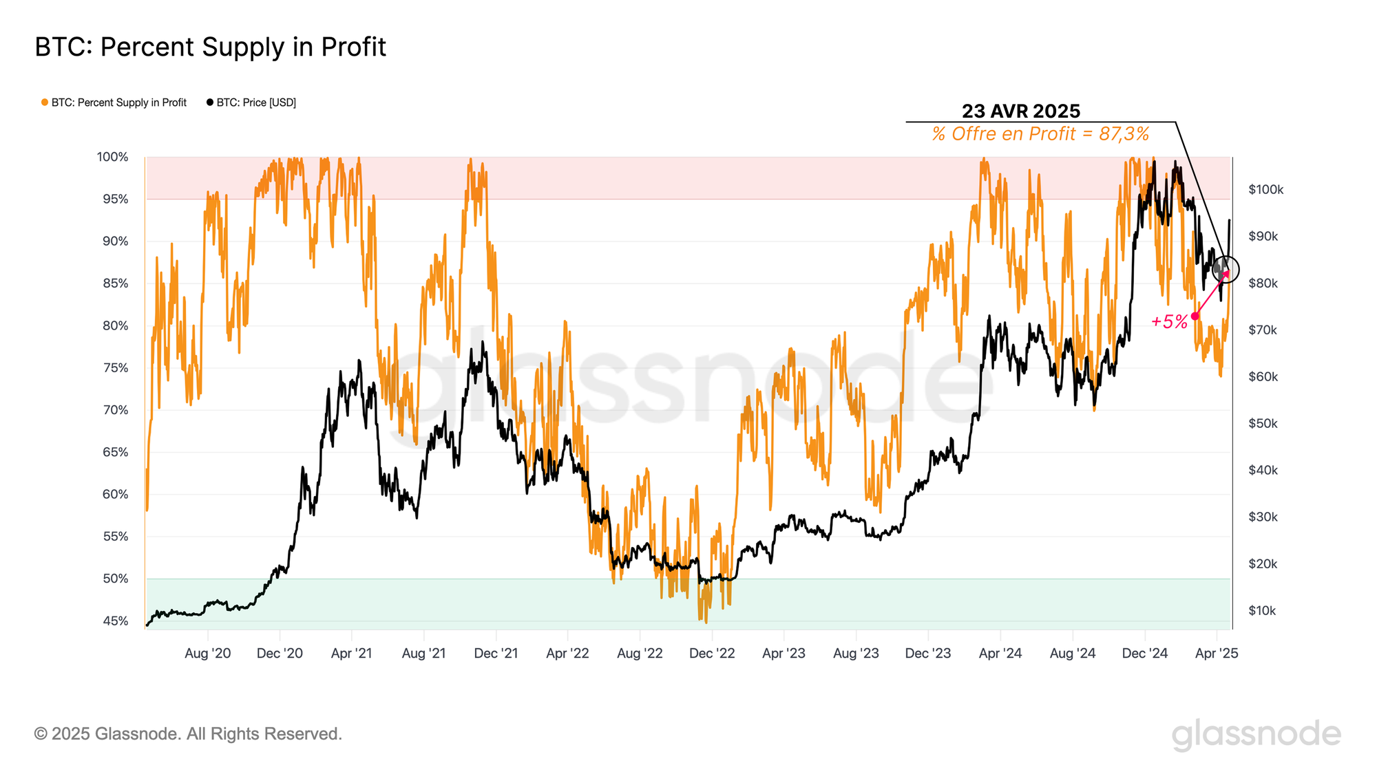 La dernière poussée du marché à 94 300 $ s'est accompagnée d'une reprise notable des profits latents détenus par les investisseurs. Le pourcentage d'offre en profit est passé à 87,3 %, ce qui marque un net rebond par rapport aux niveaux les plus bas enregistrés en mars.