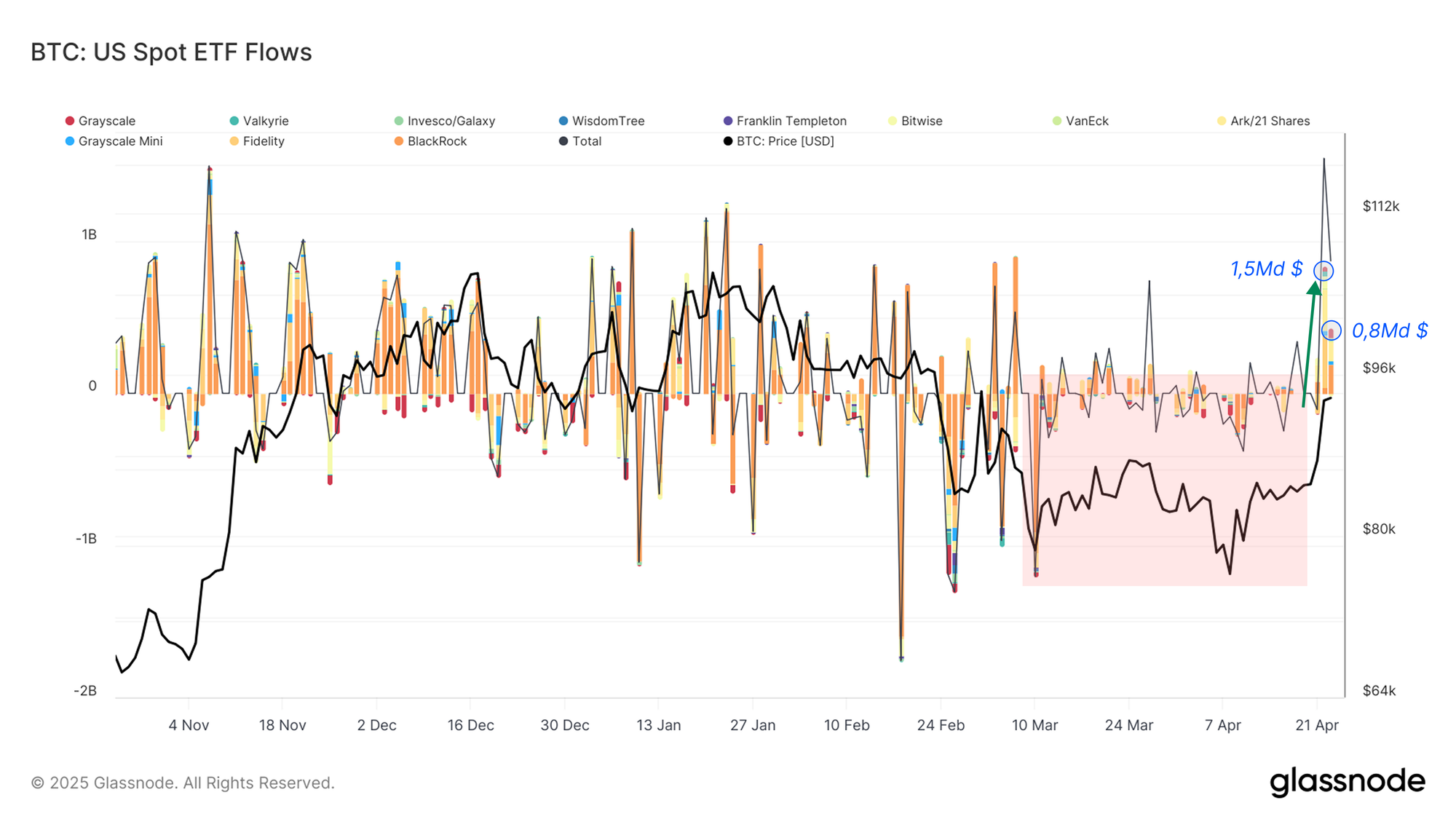 Plusieurs paramètres indiquent qu'une reprise constructive est en cours pour le BTC. La demande institutionnelle pourrait revenir pour le BTC, les ETF ayant enregistré des entrées nettes de 1,54 milliard $ en une seule journée.