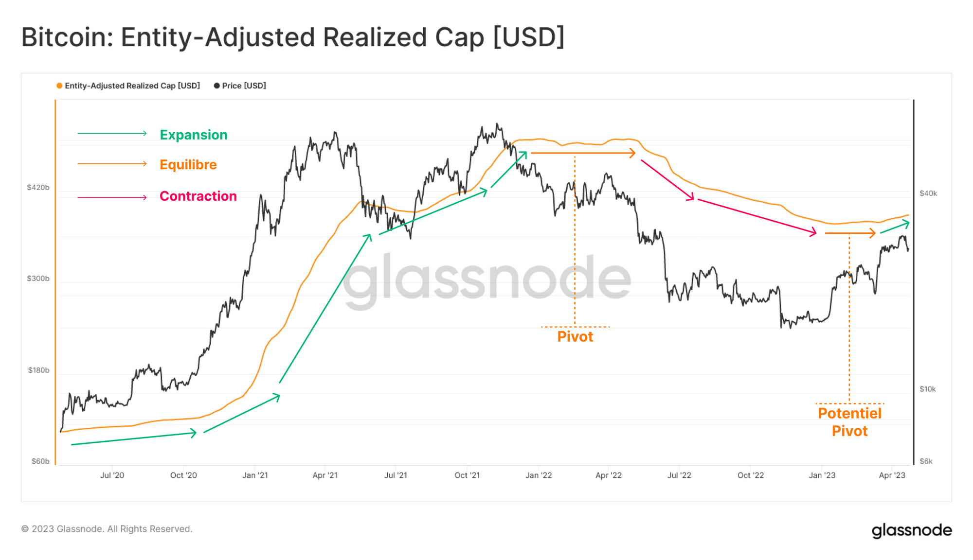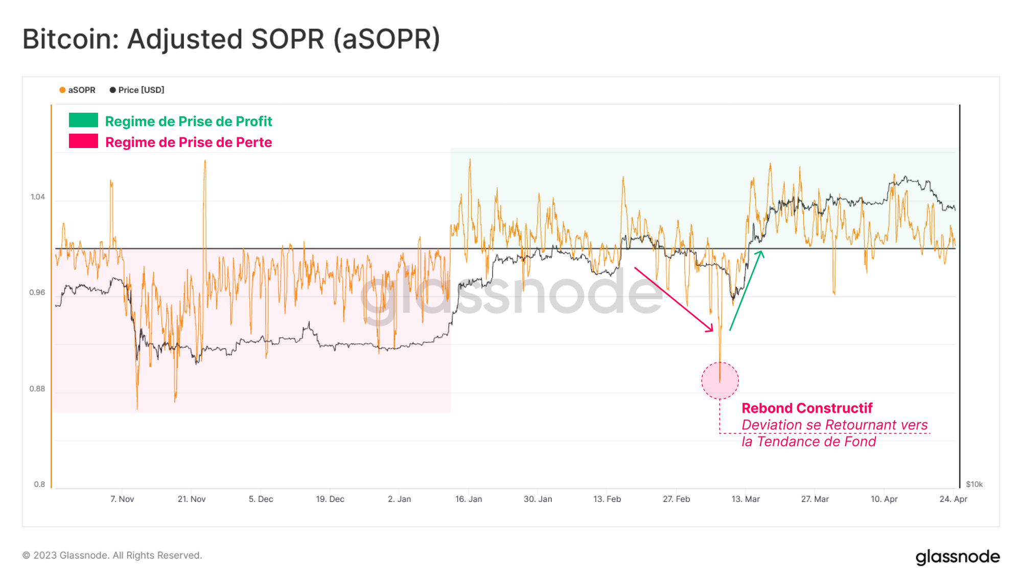 Avec la forte ouverture de l'année 2023, le marché est passé en toute confiance d'un régime de pertes non réalisées à un régime de bénéfices non réalisés, comme le montre la forte divergence entre l'offre détenue en profit et en perte. Dans ce contexte, l'incitation à la prise des bénéfice augmente.