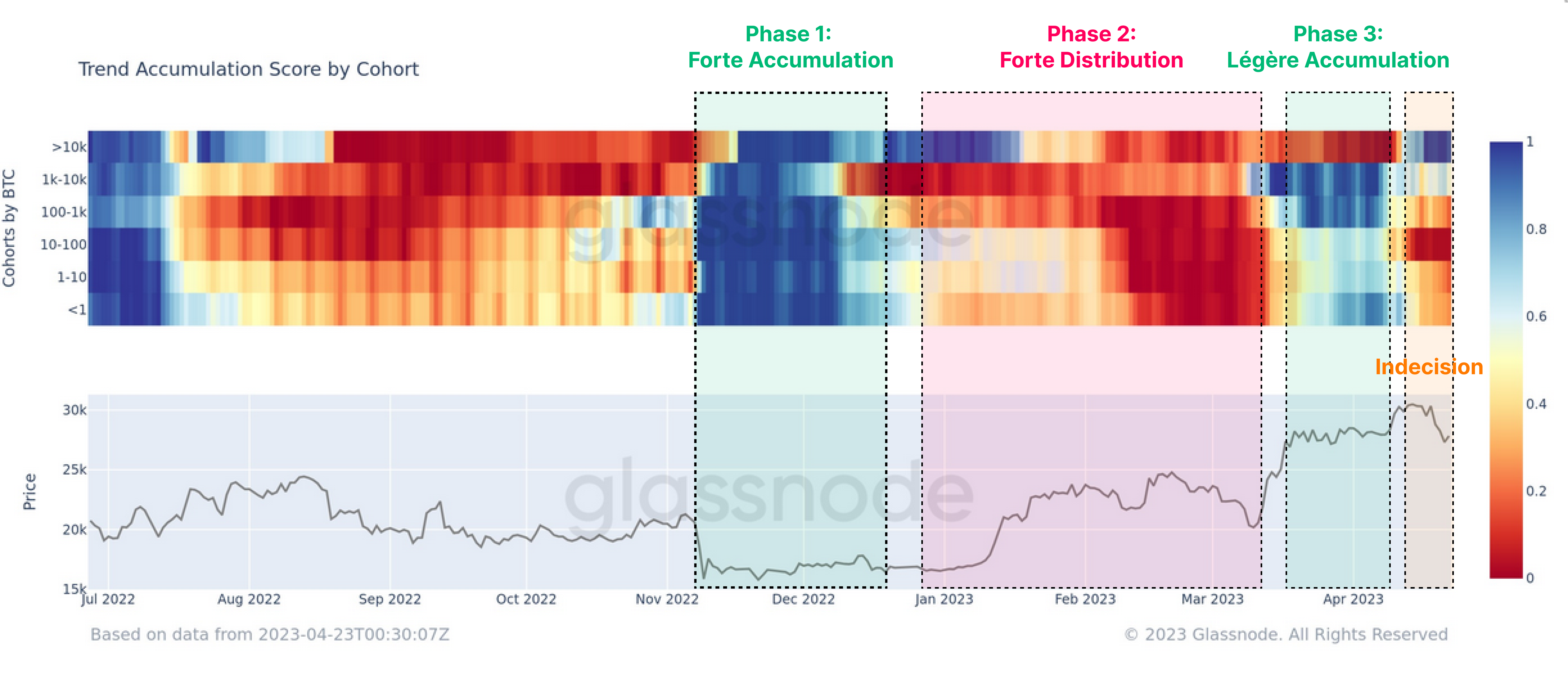 Au cours des dernières semaines, nous pouvons observer un mélange de comportements, suggérant une indécision au sein des cohortes, à l'exception des entités possédant 10 000 BTC ou plus. Cela correspond à la consolidation globale, à la brève cassure des 30 000 $ et à la vente vers les 27 000 $ cette semaine.