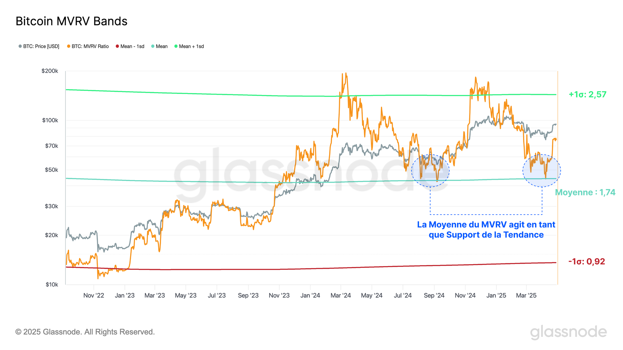 La moyenne à long terme du MVRV agit effectivement comme un niveau de support pour la confiance des investisseurs, et un mouvement soutenu du MVRV au-dessus de ce niveau serait une observation constructive.