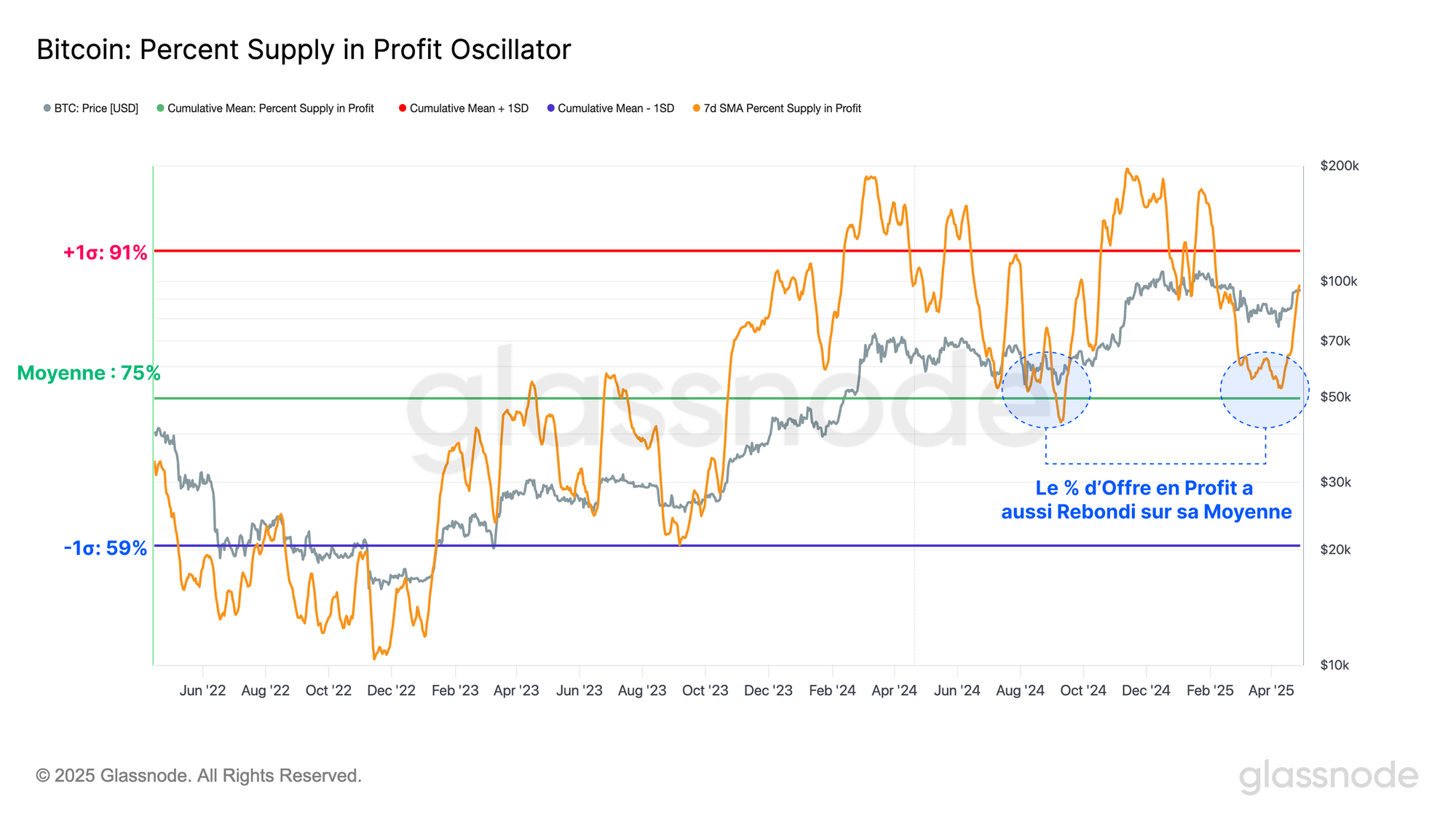 Tout comme le ratio MVRV, le pourcentage d'offre en profit a également enregistré un fort rebond par rapport à sa moyenne à long terme, ce qui nous conforte dans l'idée qu'un changement significatif des attentes des investisseurs est en train de se produire.