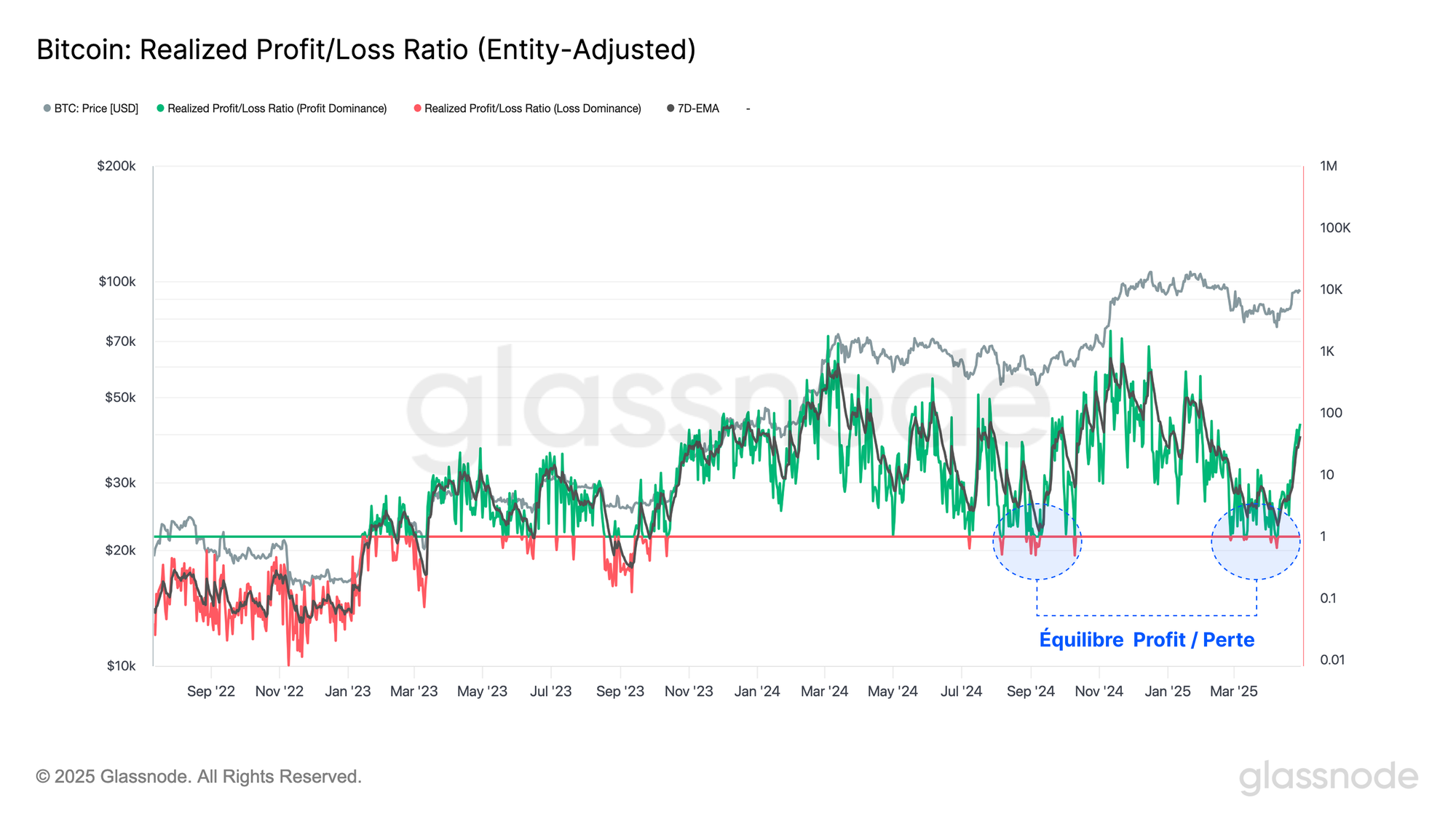 Au cours de la tendance baissière, le ratio profit/perte s'est approché de sa valeur d'équilibre, ce qui suggère que la taille des événements de prise de profits et de pertes a été équilibrée.
