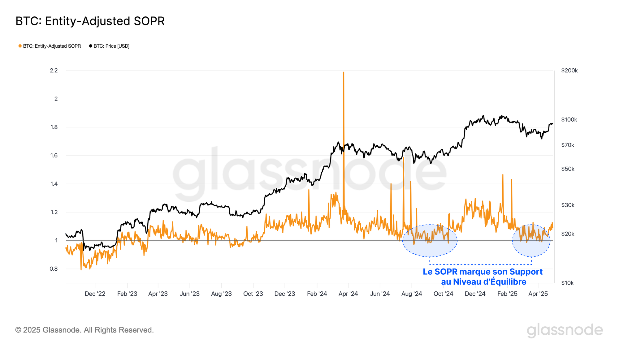 Le SOPR a également trouvé un support solide à sa valeur d'équilibre de 1,0 et est resté dans un régime dominé par les profits. Il est constructif d'observer des baisses rapides et courtes du point neutre, ce qui suggère que les investisseurs qui ont acheté près du sommet local sont éliminés.