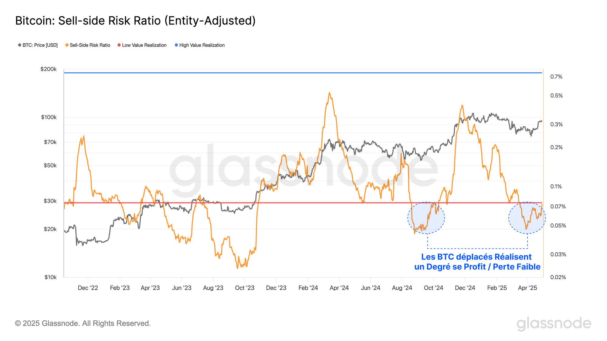 Ce ratio reste inférieur à sa fourchette basse, ce qui suggère que la plupart des BTC transférés on-chain s'échangent à un prix proche de leur prix d'achat initial.