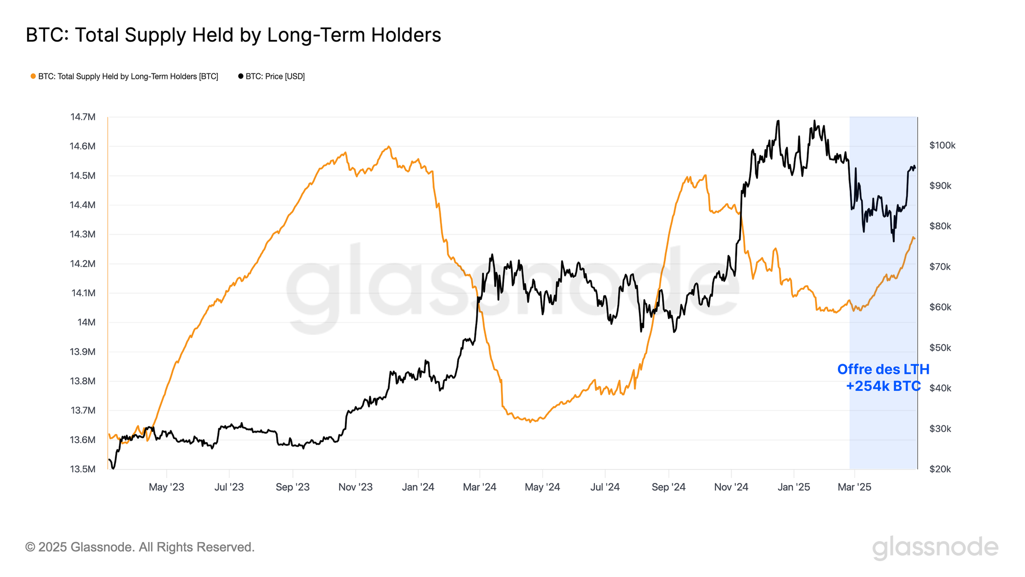 Les avoirs détenus par les LTH continuent d'augmenter, avec 254 000 BTC migrant à travers le seuil de 155 jours depuis le récent bas, dont beaucoup ont été accumulés à des prix supérieurs à 95 000 $.