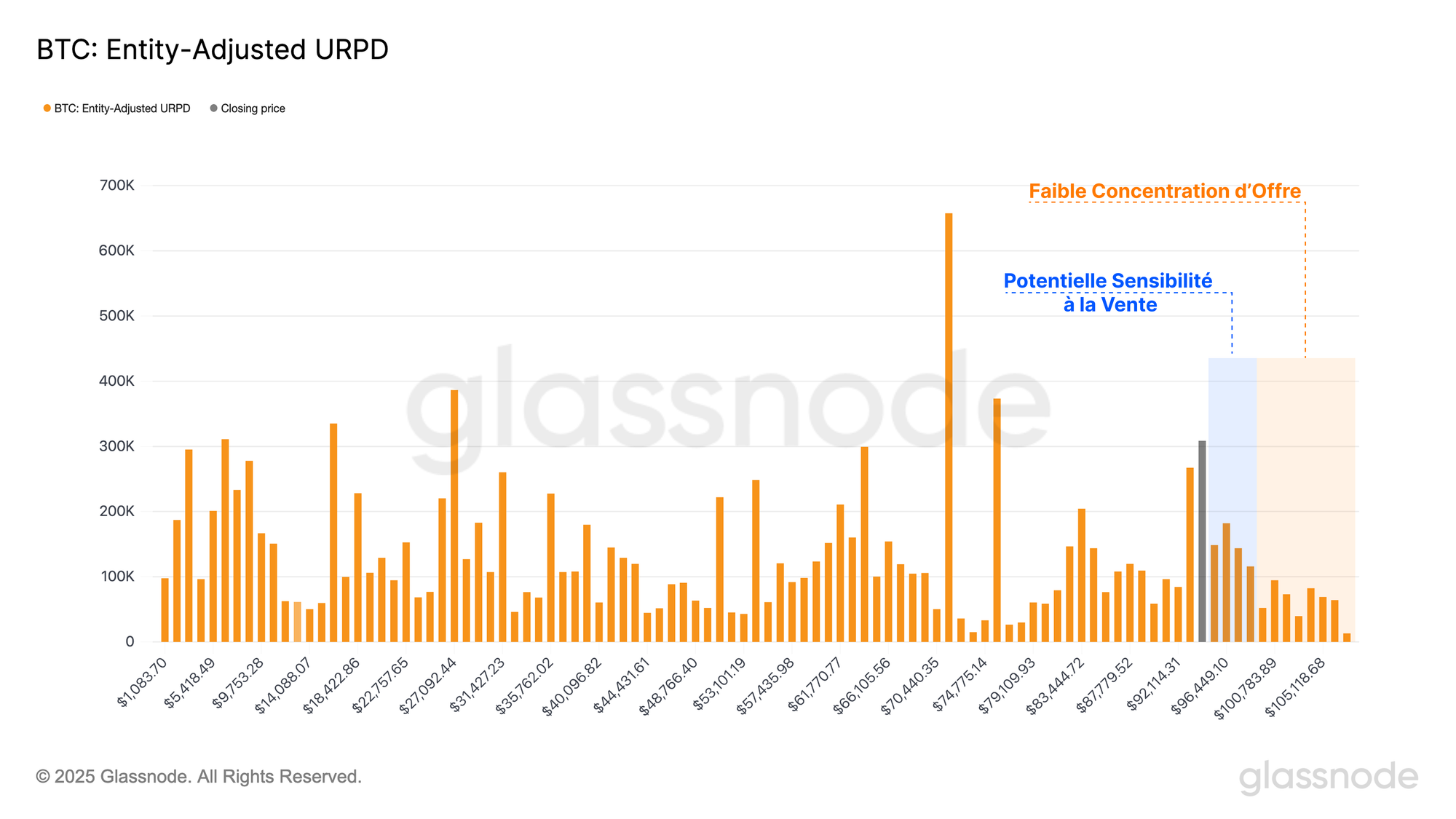 En outre, une concentration importante de BTC reste détenue à perte dans la région de 95 000 $ à 98 000 $. Lorsque le marché s'approchera de cette zone, certains investisseurs pourraient choisir de sortir à leur prix d'équilibre, ajoutant ainsi une résistance supplémentaire.