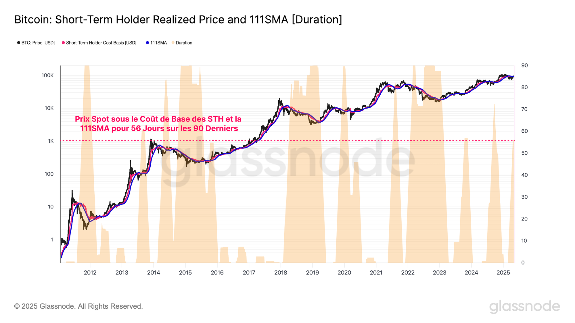 Dans cette analyse, nous nous concentrons sur la 111DMA, une moyenne technique que de nombreux analystes utilisent pour évaluer le momentum. Parallèlement, nous utiliserons le coût de base des investisseurs à court terme (STH).