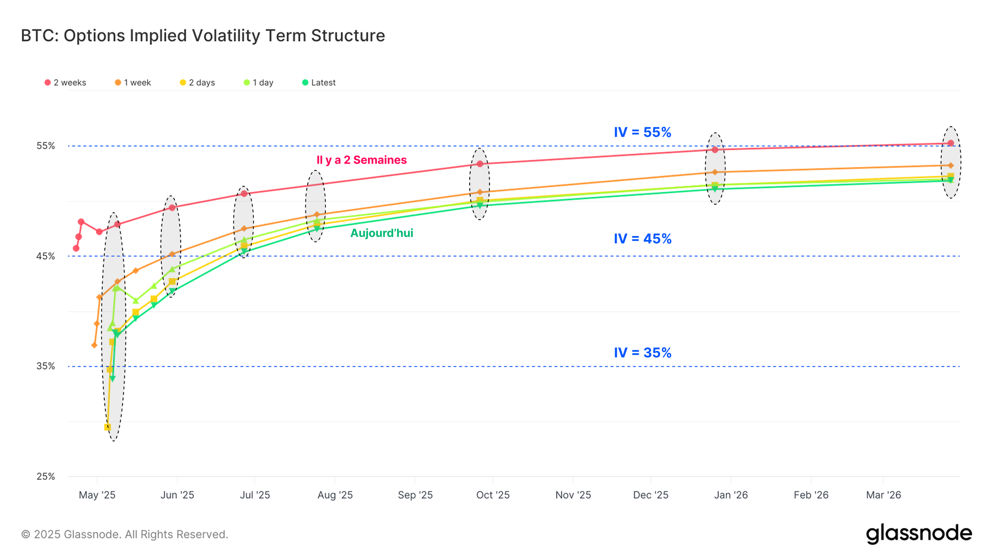 Nous pouvons constater la compression progressive des primes de volatilité grâce à la structure à terme de la volatilité implicite, qui illustre l'évolution des attentes pour le marché au cours des deux dernières semaines.