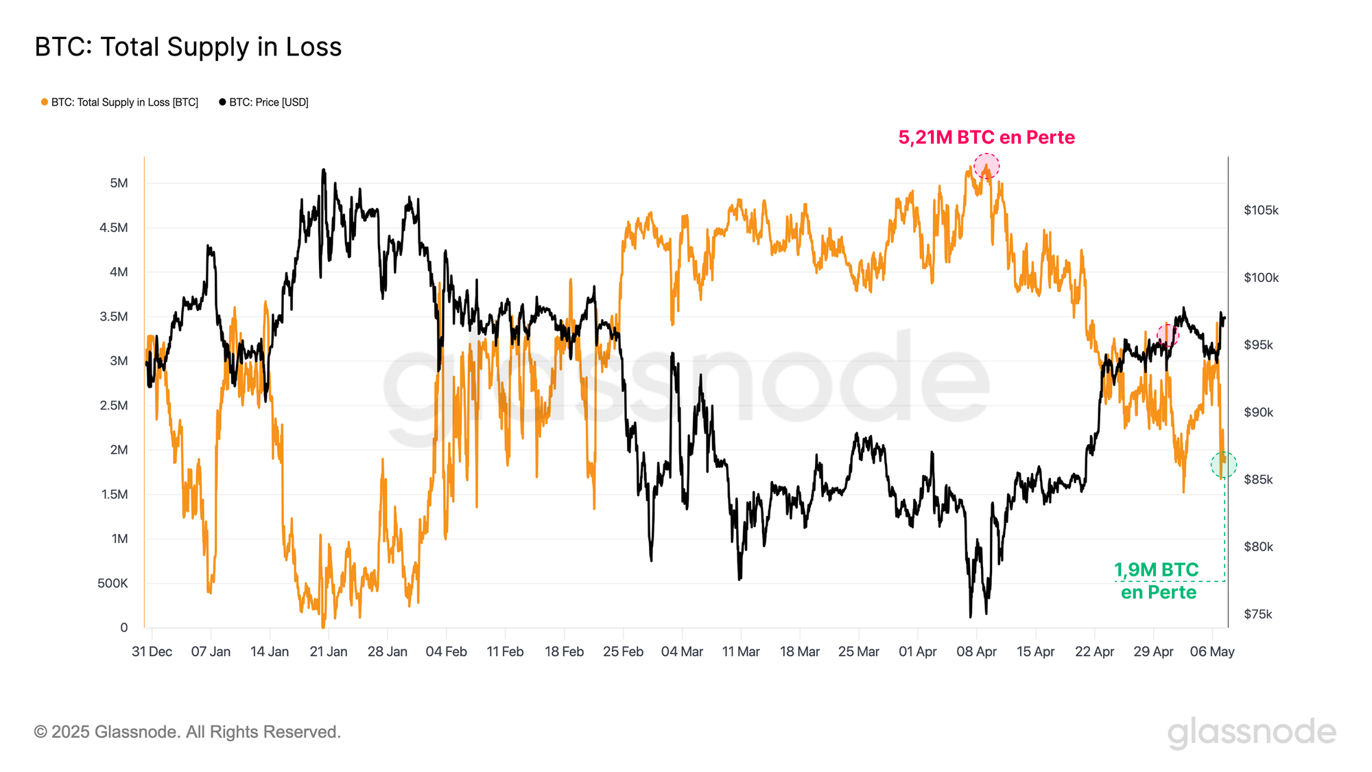 - Le rebond des prix a apporté un soulagement significatif aux participants du marché. Aux 74 000 $, plus de 5 millions de BTC étaient détenus en perte. Aujourd'hui, ce chiffre n'est plus que de 2 millions de BTC, et plus de 3 millions de BTC sont redevenus rentables.