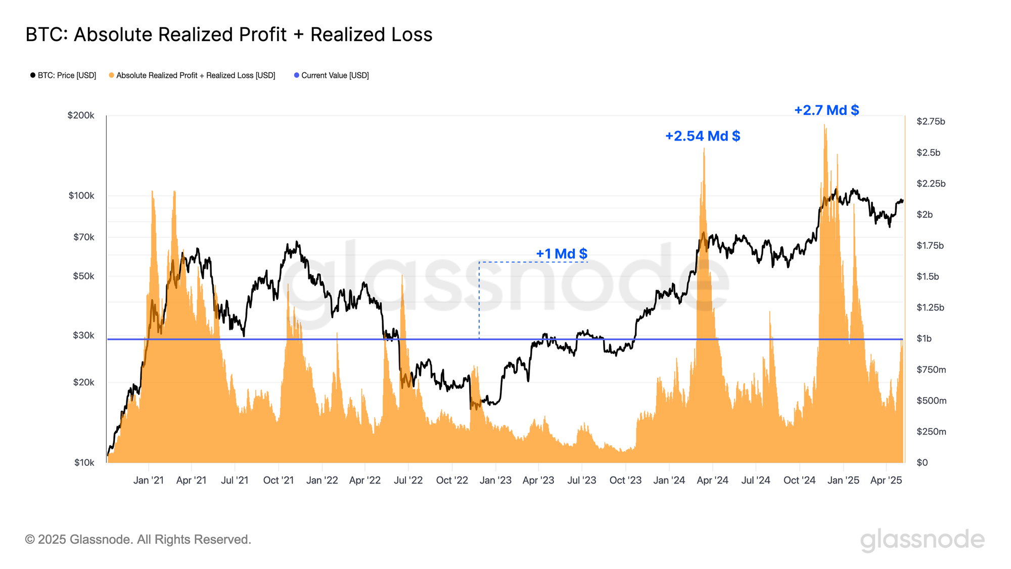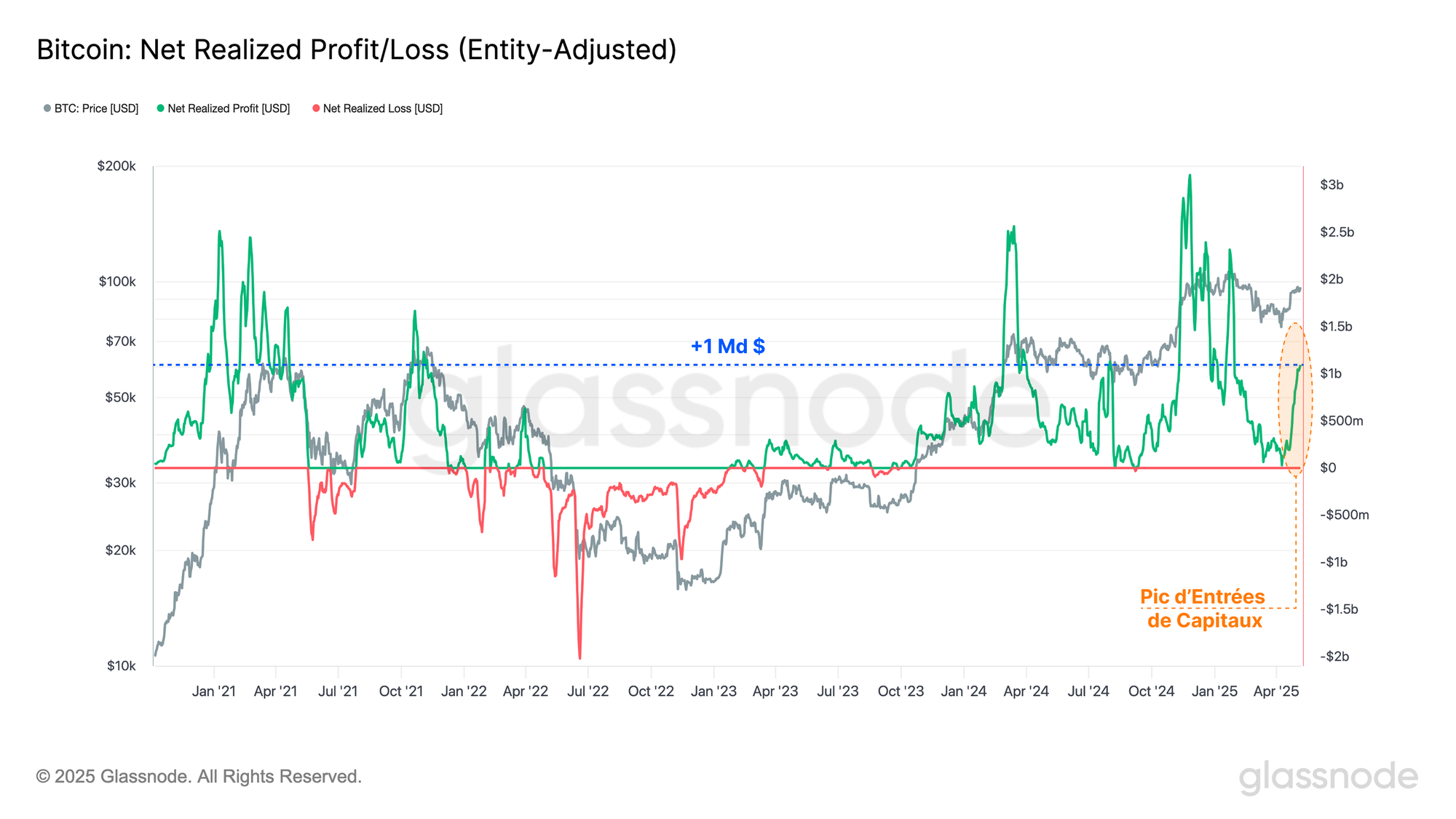 La mesure des profits/pertes nets réalisés est calculée comme la première dérivée de la capitalisation réalisée, ce qui nous permet d'observer l'ampleur des flux nets de capitaux en USD qui s'opèrent chaque jour.