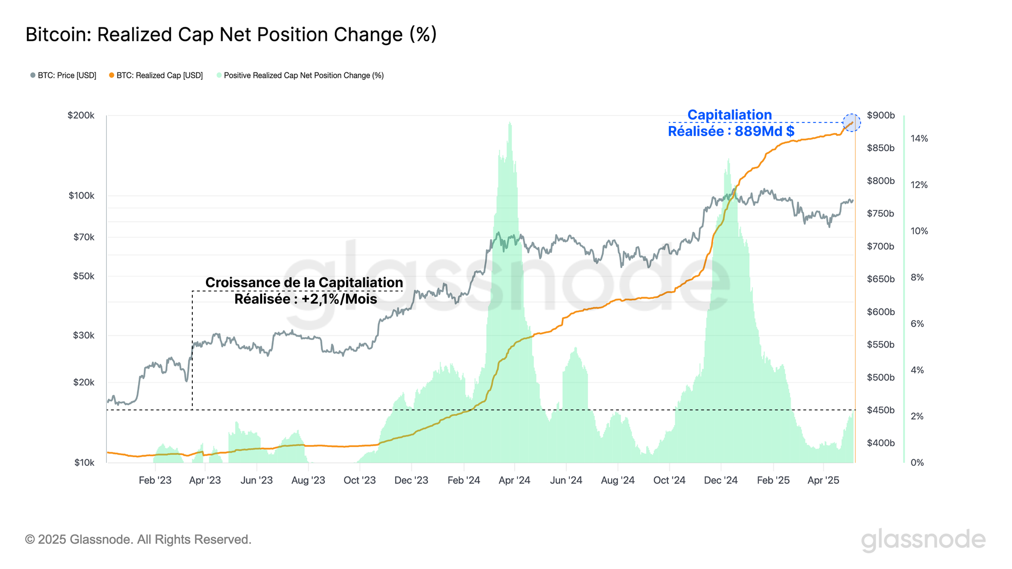 La capitalisation réalisée du bitcoin se négocie actuellement à un ATH de 889 milliards $. Le taux de croissance du capital investi a augmenté de +2,1 % au cours du dernier mois.