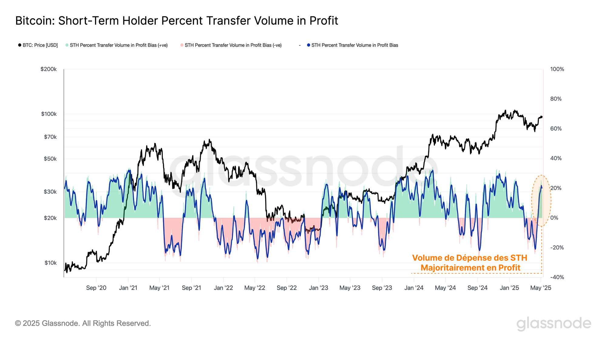Cette amélioration se répercute directement sur leur comportement en matière de dépenses. La métrique ci-dessous montre la dominance entre le volume des STH dépensé en profit et en perte, ce qui montre une transition brutale hors du régime de perte d'il y a seulement quelques semaines.