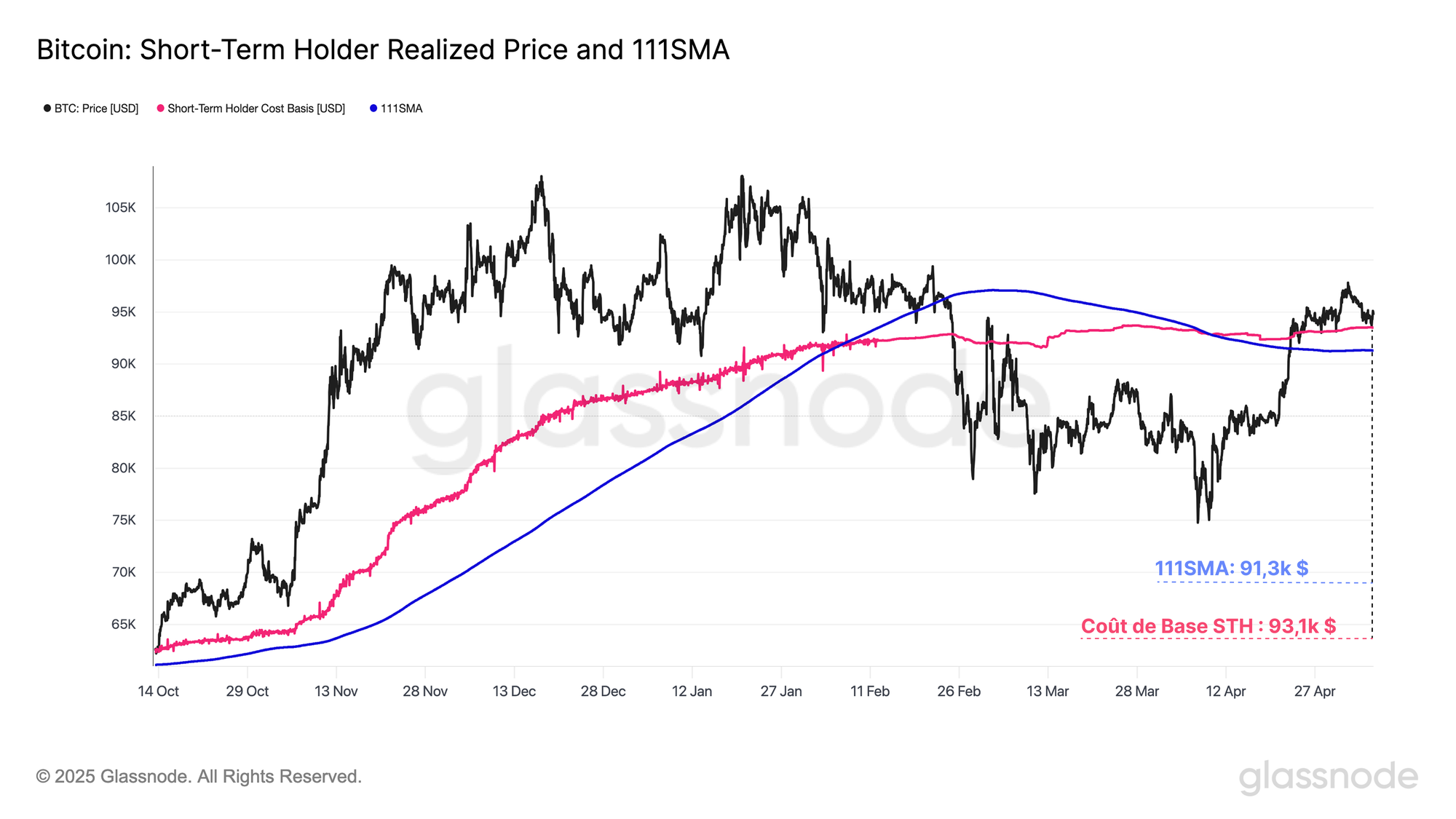 Comme indiqué dans la précédente analyse, la 111DMA et le coût de base des investisseurs à court terme sont deux niveaux critiques à maintenir pour que le marché conserve une dynamique de prix positive.