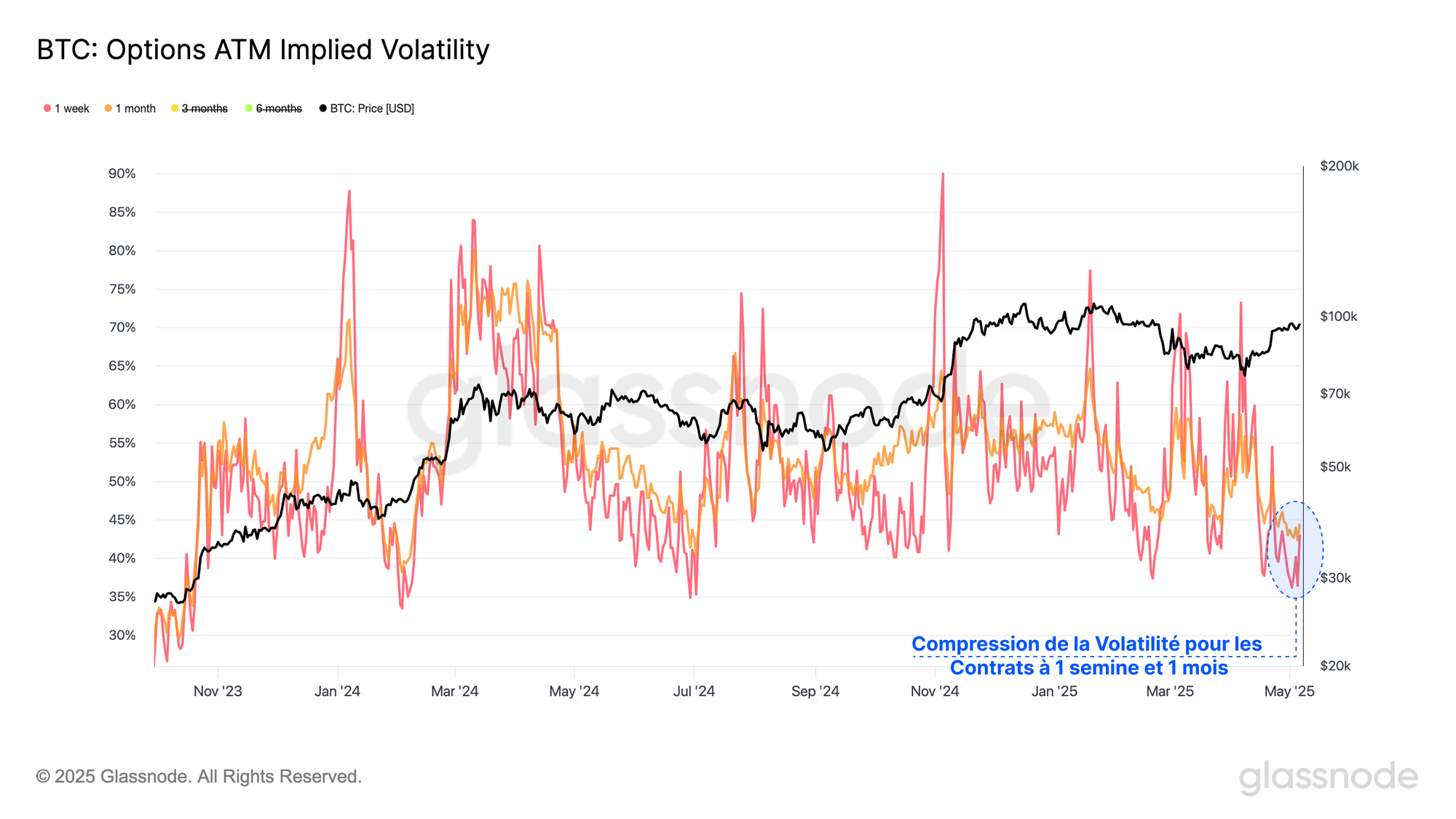 Les primes de volatilité sont comprimées sur les marchés d'options et plusieurs indicateurs on-chain suggèrent que le marché se trouve à un point de décision critique et que la volatilité à venir pourrait être sous-évaluée.