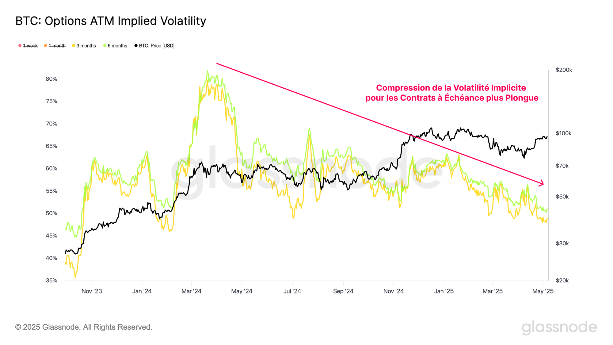 Une tendance similaire est observée pour les contrats de plus longue durée, les primes de volatilité implicites pour les échéances à 3 mois et à 6 mois se comprimant régulièrement depuis le sommet historique de mars 2024.