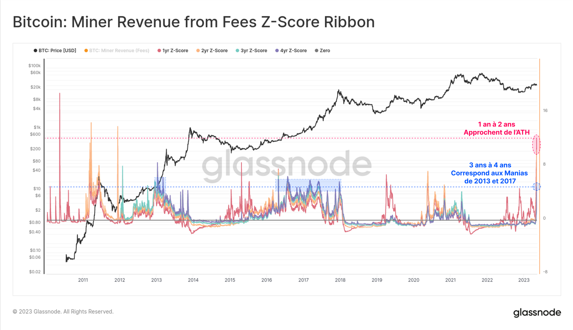 L'accélération de la pression sur le marché des frais est également significative d'un point de vue historique. Le graphique ci-dessous présente une série de Z-scores des revenus des mineurs, avec des fenêtres allant d'un an à quatre ans.