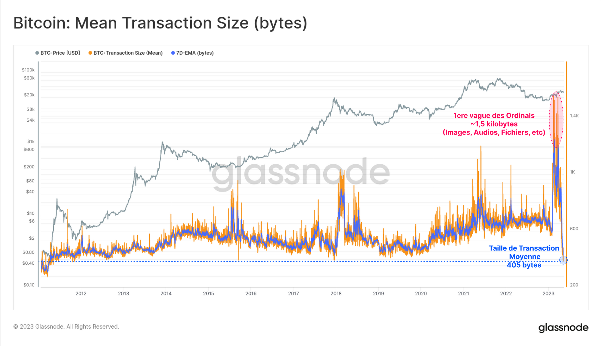 Étant donné que les inscriptions BRC-20 ne sont que de petits fichiers texte JSON et qu'elles bénéficient de la réduction SegWit de 75 % sur les données des témoins, l'empreinte de leurs données sur la chaîne est relativement faible. Par conséquent, la taille moyenne des transactions (en octets) est tombée à 405 octets, ce qui est presque un record absolu.