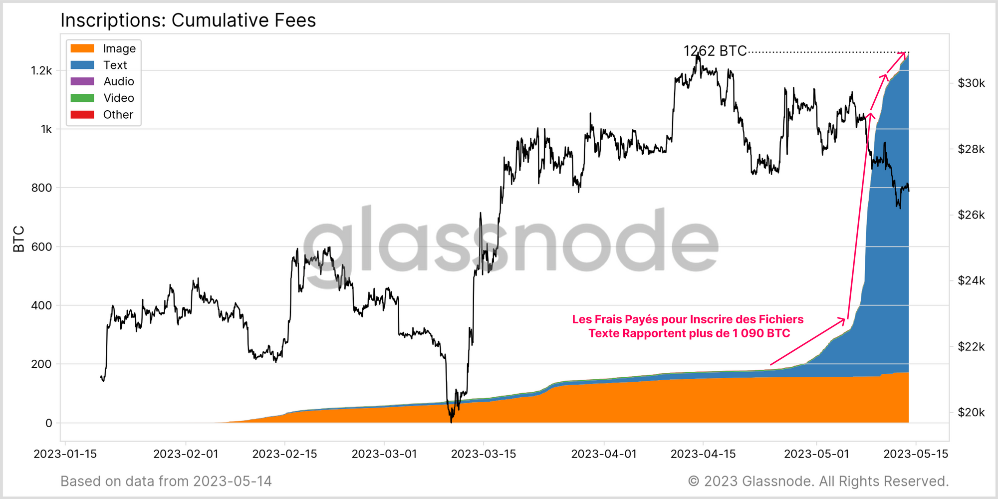 Au total, les Inscriptions ont payé une somme cumulée de 1 262 BTC en frais aux mineurs, dont 1 090 BTC (86 %) au cours de la dernière semaine. Le graphique ci-dessous montre à quel point la pression des frais associés aux fichiers texte a été explosive.