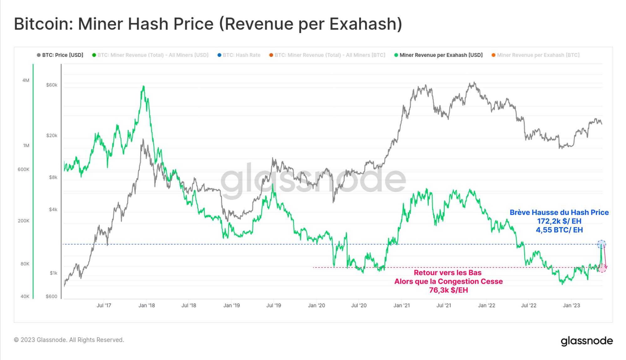 Le revenu en USD par Exahash, souvent appelé prix du hash ou hashprice, est l'outil idéal pour évaluer l'impact sur les revenus des mineurs. Il tient compte non seulement du prix spot du BTC et de la pression exercée sur les frais, mais aussi du hashrate estimé qui est en jeu pour obtenir la récompense de bloc.