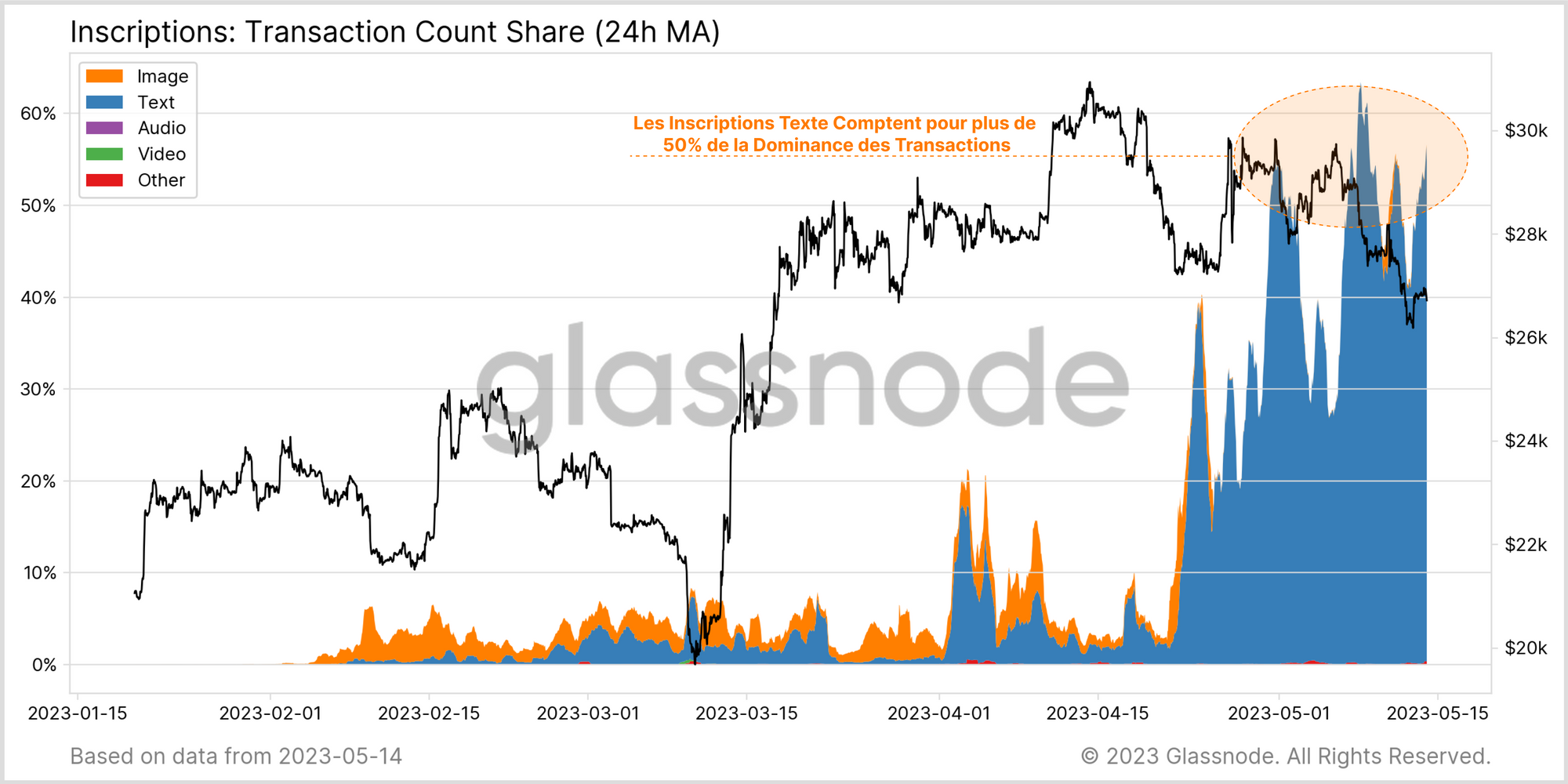 Sur l'ensemble des transactions confirmées, les Inscriptions de texte représentaient plus de 50 %. Cette proportion est nettement plus élevée que les 5 à 20 % d'inscriptions des images observés lors de la première vague, ce qui démontre l'ampleur de cette vague de demande.