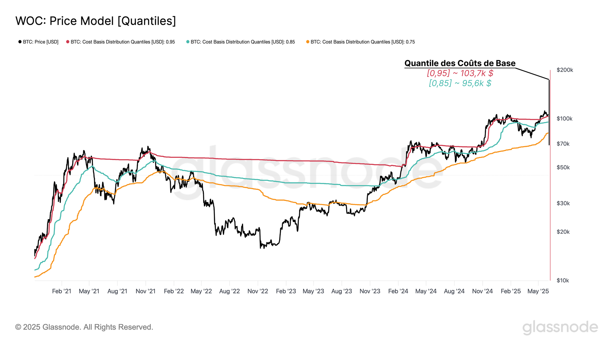 Actuellement, le quantile 0,95 se situe à 103 700 $, agissant comme le premie support on-chain. Si la pression de vente persiste, le prochain niveau à surveiller est le quantile 0,85 à 95 600 $.