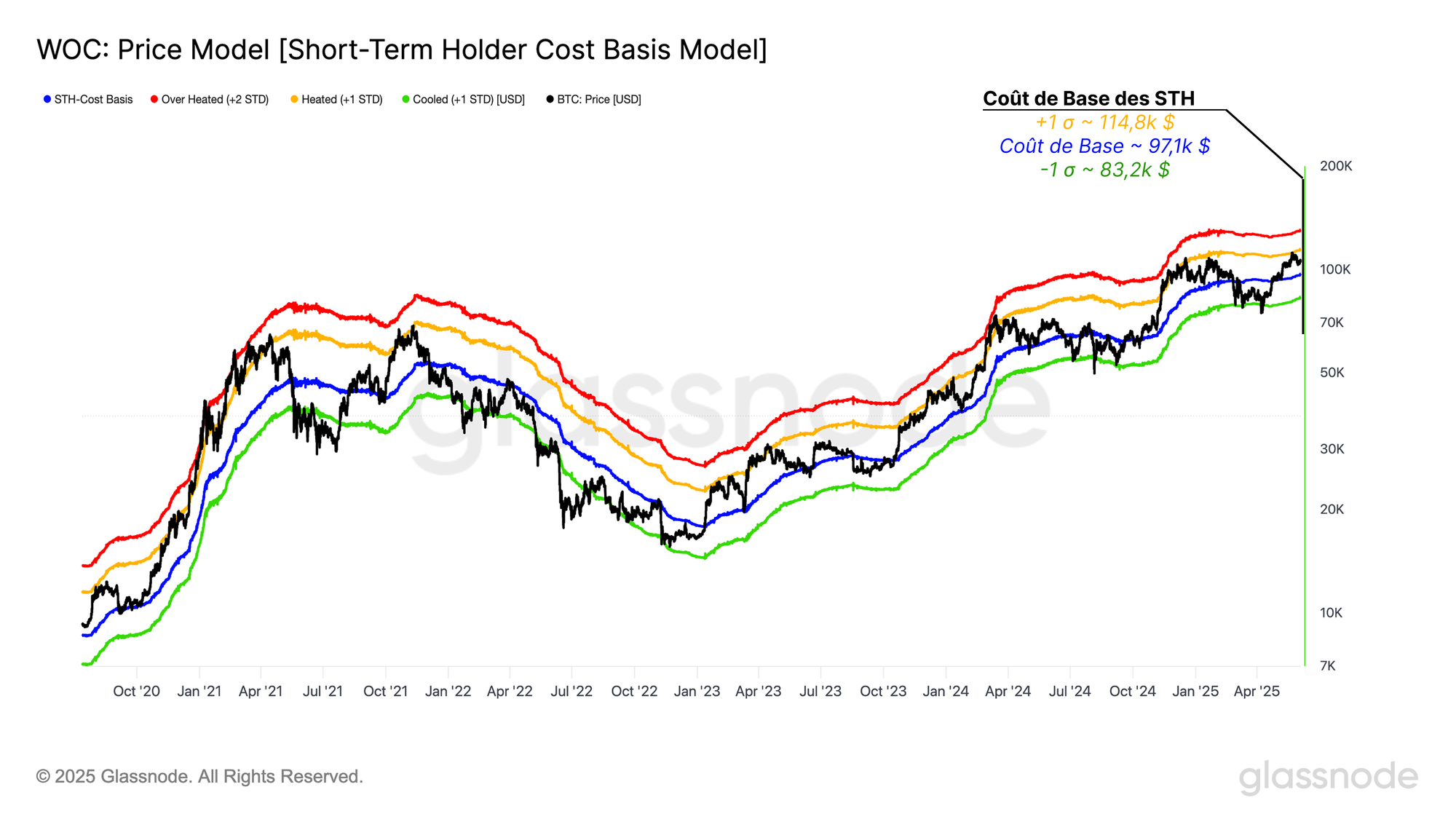 L'un des modèles les plus pertinents à cet égard est le coût de base des investisseurs à court terme (STH), qui représente le prix d'achat moyen des BTC détenus pendant moins de 155 jours.