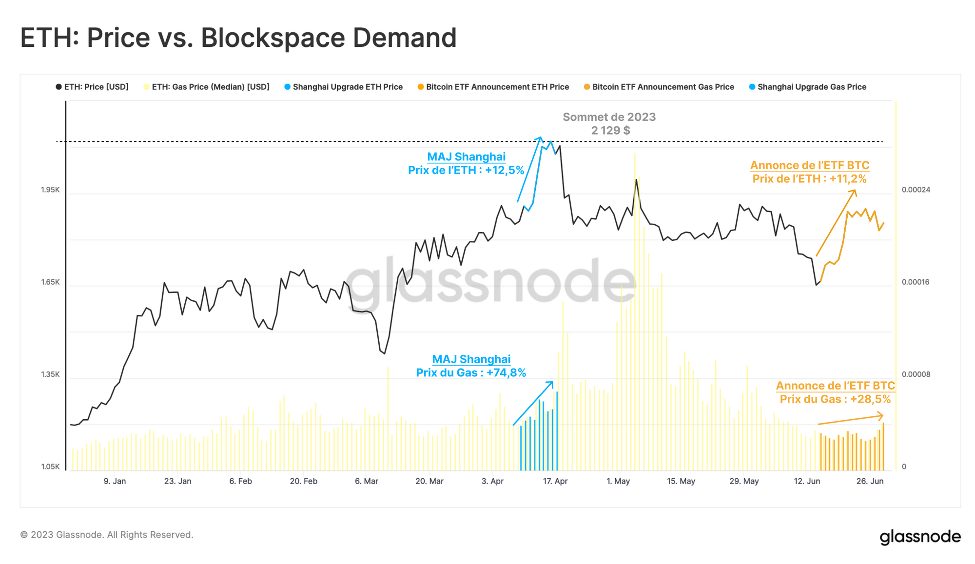 Jusqu'à présent, en 2023, la hausse des prix de l'ETH ne s'est pas encore traduite par une augmentation significative de l'activité du réseau. Les prix du gas, qui sont considérés comme un indicateur de la demande d'espace de blocs, sont restés relativement bas, en particulier au cours de la semaine qui a suivi l'annonce du dépôt de la demande d'ETF.
