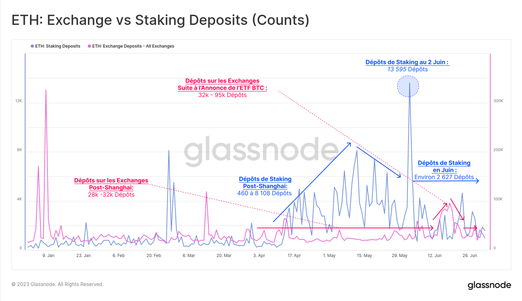 L'activité de dépôt (nombre de transactions) a atteint un pic le 2 juin, enregistrant plus de 13 595 nouveaux dépôts (d'une valeur de plus de 408 000 ETH). À titre de comparaison, nous pouvons comparer ce chiffre aux transactions de dépôt de l'ETH, qui sont restées stables à environ 30 000 transactions de dépôt au cours de cette période.