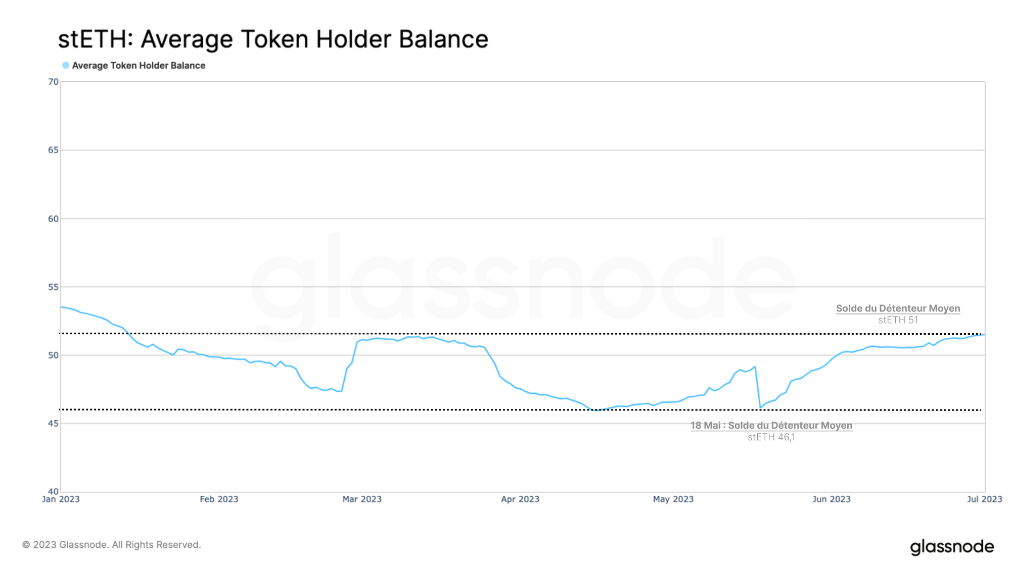 Le solde moyen des stETH a augmenté à 51,0 stETH (100 000 $) depuis Shanghai, ce qui indique que les détenteurs de tokens existants augmentent effectivement leur part d'ETH staké sous la forme de stETH.