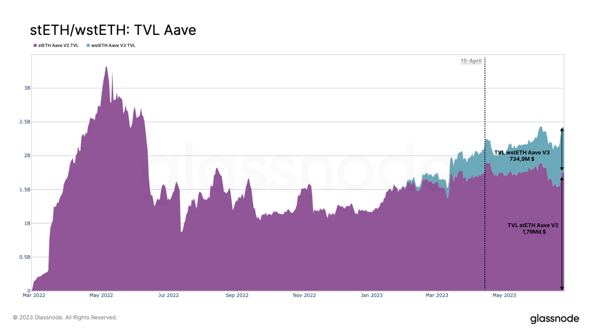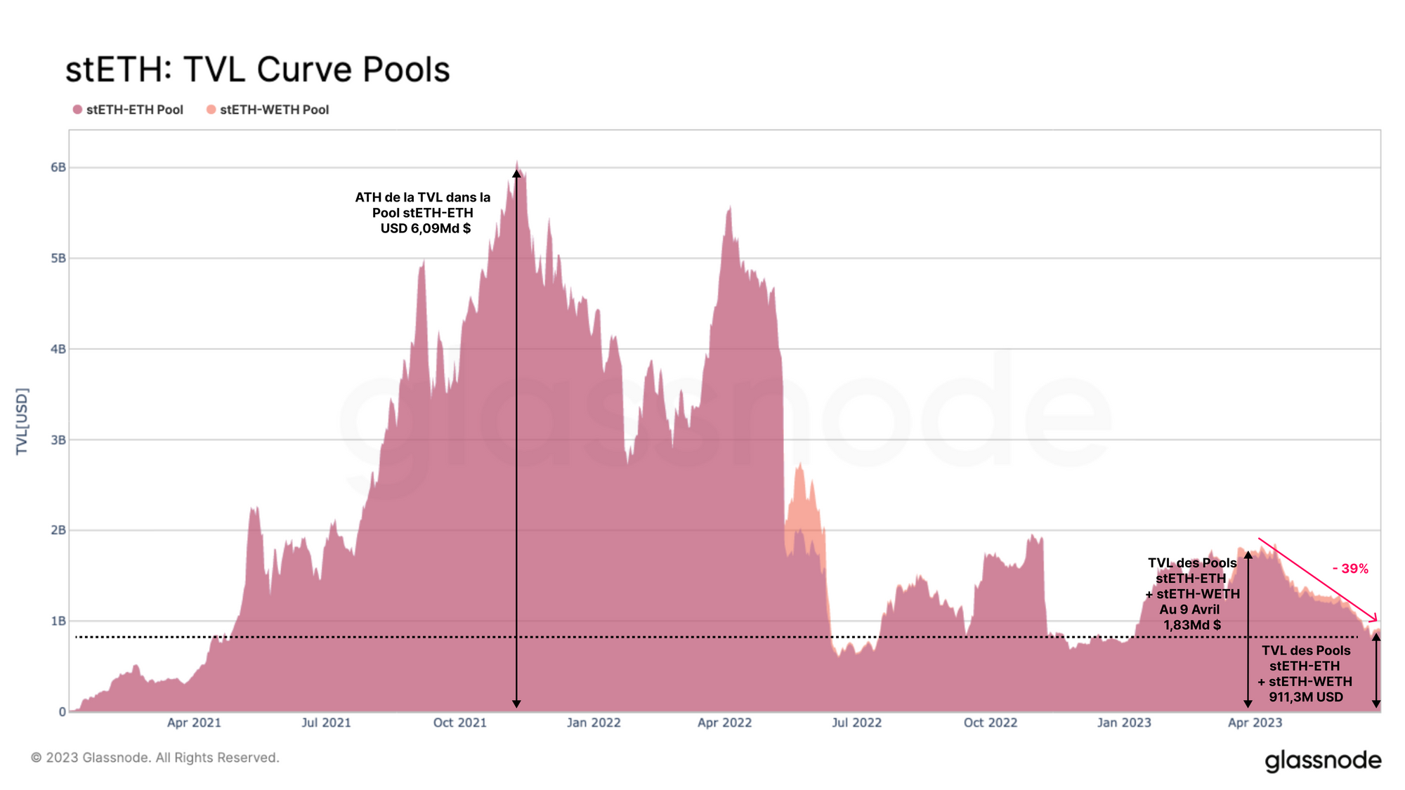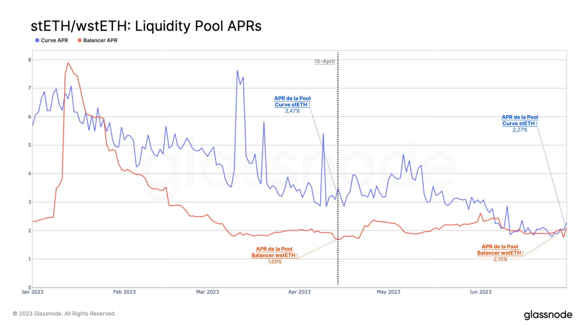En examinant le rendement annualisé (APR) des deux pools, nous pouvons constater qu'une tendance baissière constante s'est établie en 2023. Pour notre analyse, nous prenons le 15 avril comme point de référence, car c'est à peu près à cette date que la vague de nouveaux dépôts de staking a commencé, ainsi que la diminution de la liquidité sur les DEX concernés.