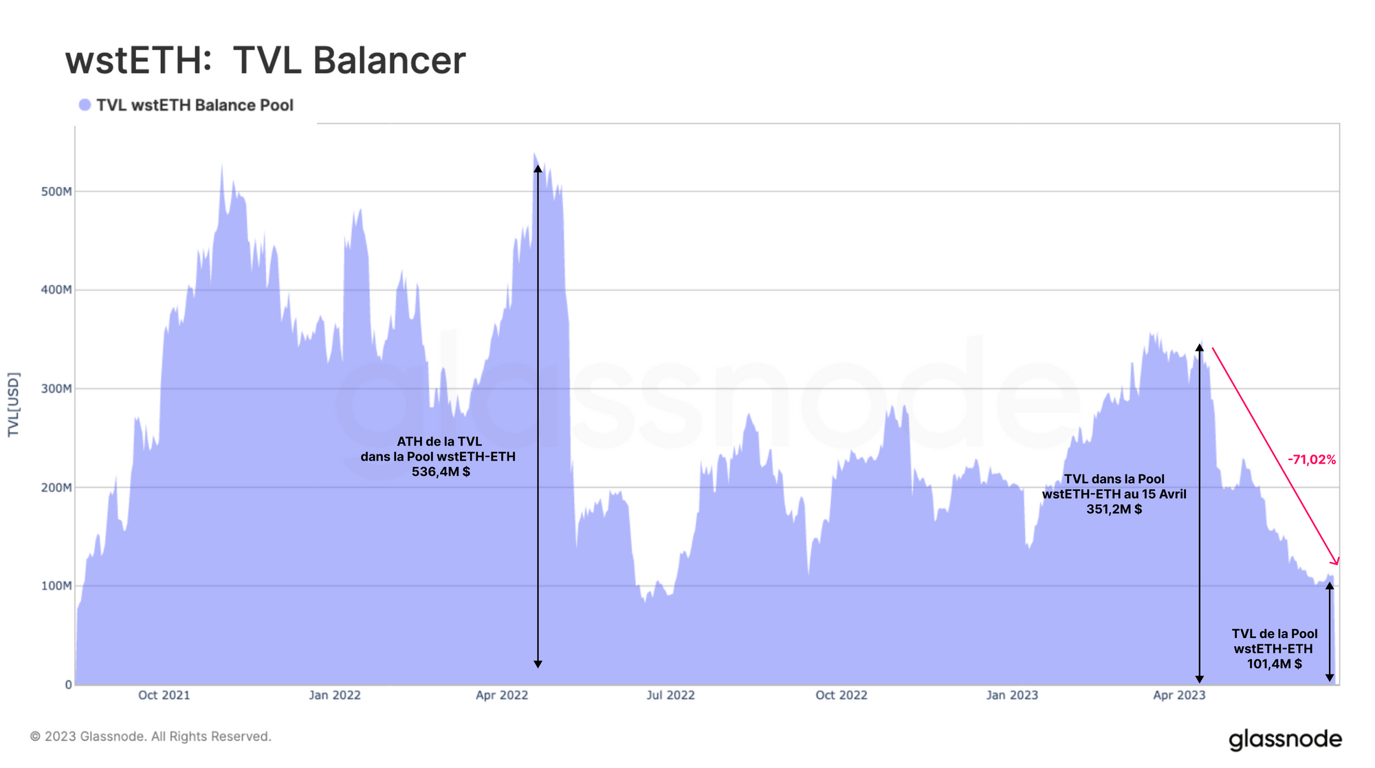 En examinant la pool wstETH-ETH sur Balancer, nous pouvons observer que cette tendance est encore plus prononcée. Depuis le 15 avril, la TVL de cette pool a diminué de 71 %, réduisant la valeur de la pool de 351,2 millions de dollars à 101,4 millions de dollars.