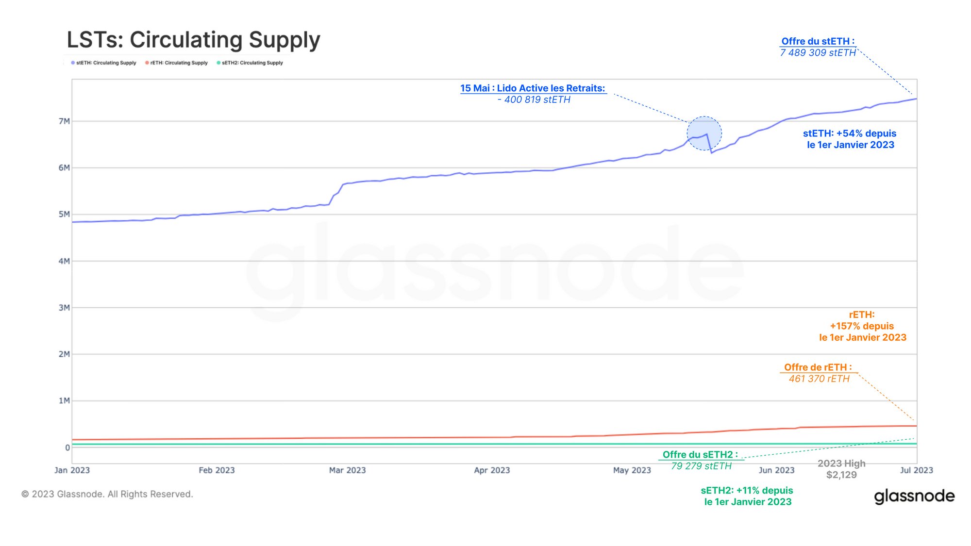 À la suite de cette mise à jour, 400 000 stETH (721 millions de dollars) ont été rachetés, ce qui a entraîné une contraction de l'offre de stETH. Cependant, l'énorme vague de nouveaux dépôts d'ETH a plus que compensé la baisse, poussant à un nouvel ATH de 7,49M stETH.