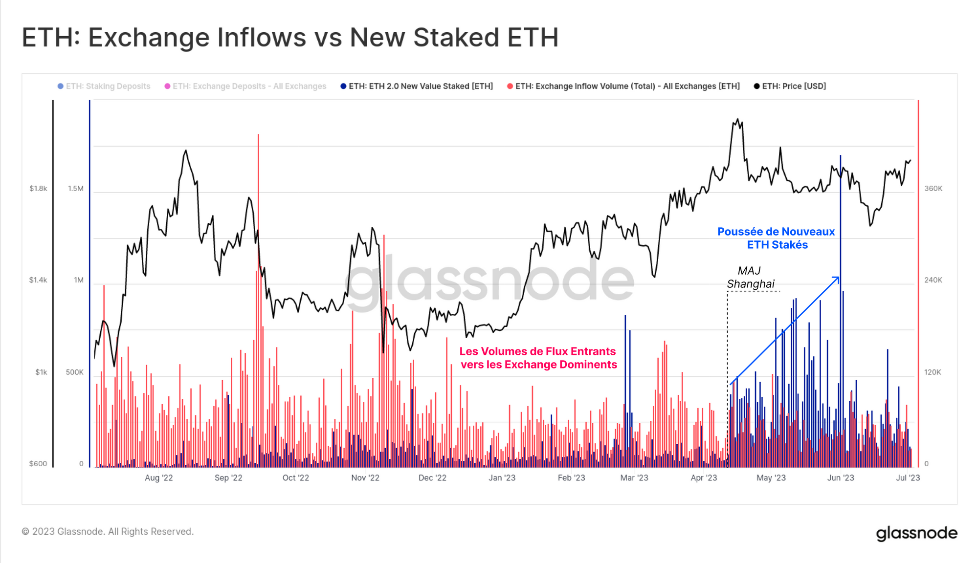 L'explosion du nombre de nouveaux ETH stakés est encore plus claire si l'on compare le volume d'ETH staké (en bleu) au volume des flux des exchanges (en rouge). Le volume d'ETH nouvellement mis en jeu a été plus élevé, ou égal en termes d'échelle, aux flux d'entrée des exchanges depuis que Shanghai a été lancé.