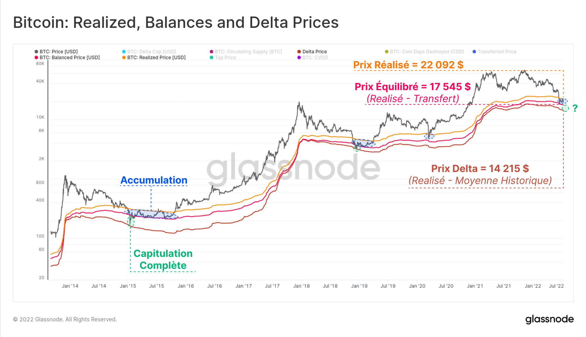 Les points bas des marchés baissiers de 2015 et 2018 ont tous deux été fixés avec une mèche à court terme vers le prix Delta (zone verte). Cependant, les deux plages d'accumulation ont passé la majeure partie du processus de formation du fond à s'échanger entre le prix équilibré (bas de range) et le prix réalisé (haut de range), comme indiqué en bleu.