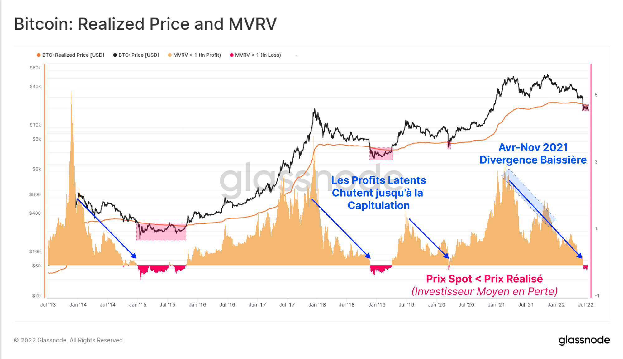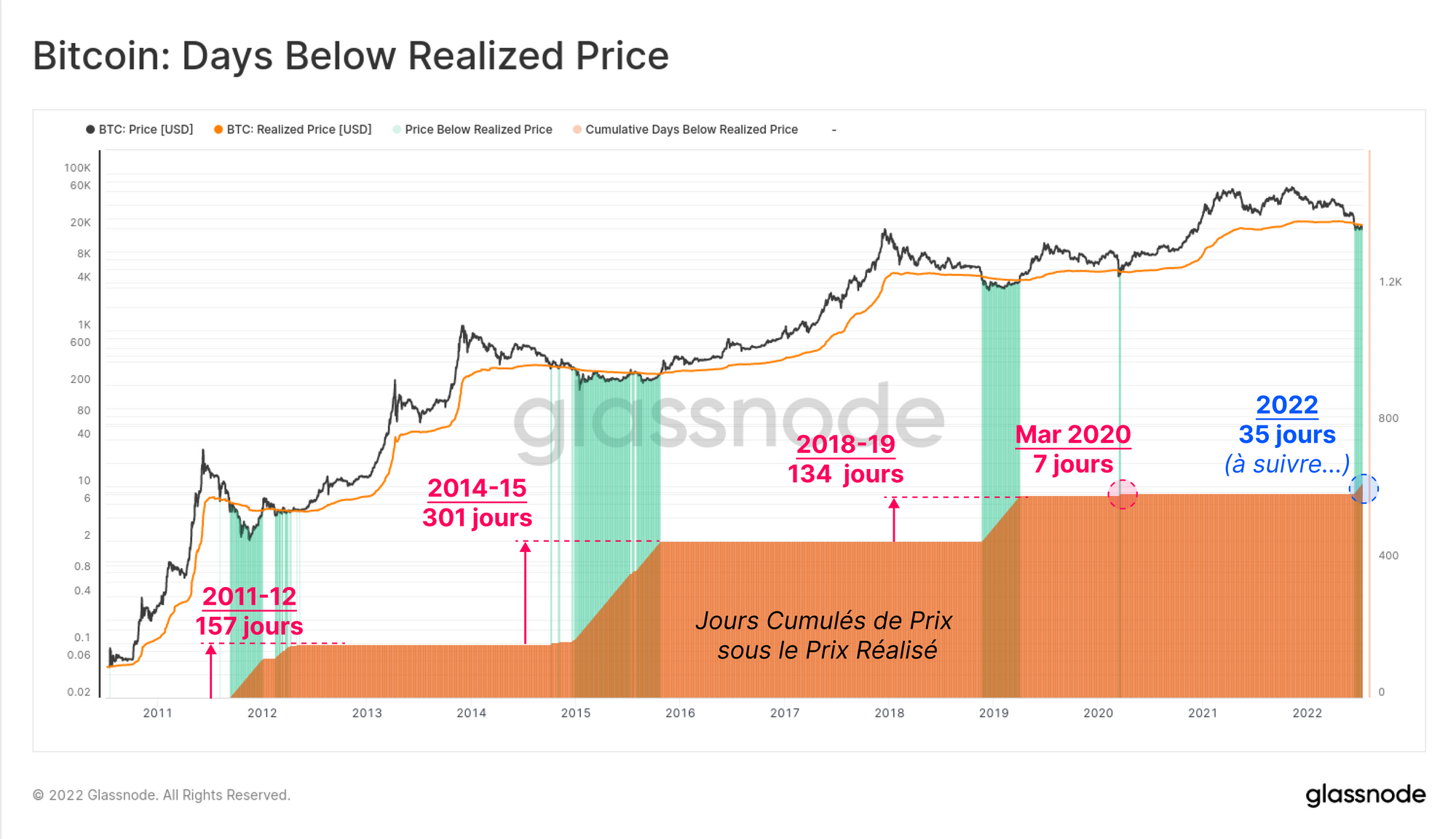 Le graphique ci-dessous montre comment les cycles baissiers précédents ont tous atteint leur point le plus bas et établi une zone d'accumulation en dessous du prix réalisé. Le temps passé sous le prix réalisé va de 7 jours en mars 2020 à 301 jours en 2015.